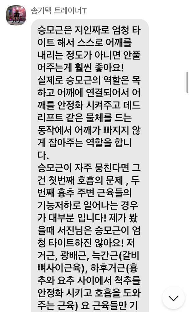송기택 선생님께 3대 운동을 좀 더 잘하기 위한 목적으로 수업을 받았습니다! 해부학에 대한 이해도가 높으셔서 제 체형이나 근육 상태에 맞는 자세를 잡아주셨고 실제로 고중량 훈련 시에 세세한 팁들도 알려주셔서 통증없이 중량을 다룰 수 있게 되었습니다👏