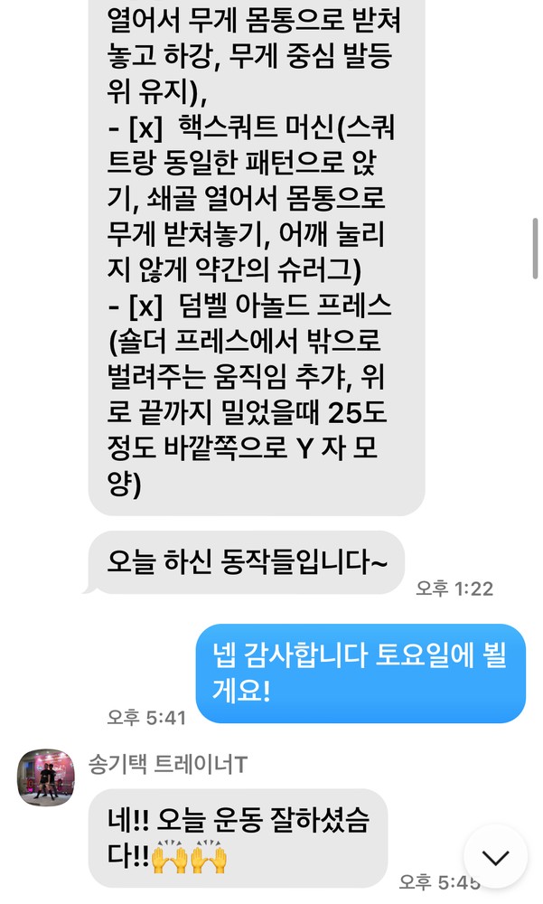 선생님과 함께 운동하면서 몸을 쓰는 것에 대해서 많이 배웠습니다😃 수업 준비도 체계적으로 늘 성실하게 해주셔서 저도 같이 힘내서 운동할 수 있었어요! 감사합니다!