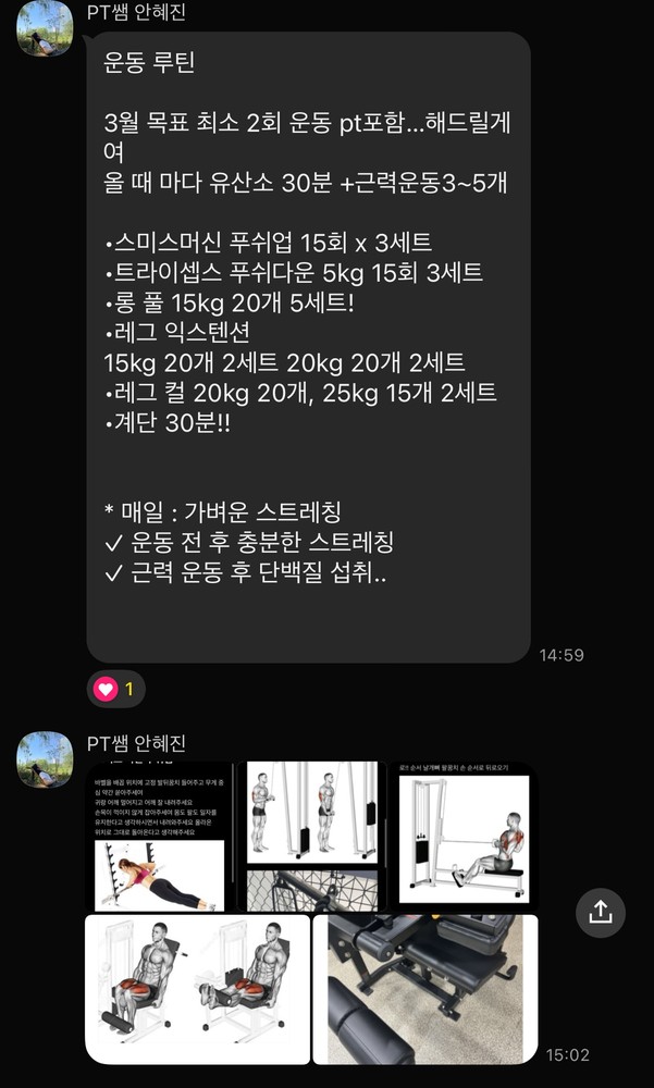 혜진쌤이 하나하나 친절하게 알려주셔서 너무 좋았어요!!! 스트레칭, 자세 교정까지 근육량 늘리기까지 눈에 띄는 변화가 있었습니다. 헬스 빼고 다양한 운동을 해봤지만 혜진쌤을 만나서 헬스가 가장 재미있는 운동이란걸 깨닫게 되었어요~~ 전 헬스장부터 지금까지 약2년동안 배우고있는데 추천합니다!!