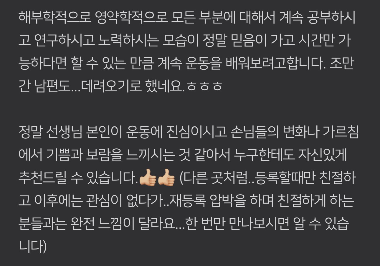 체형 교정으로 스트레스 받으시거나 운동을 시작하는 데에 있어서 어려움을 겪으셨던 분들 등록하시면 정말 정말 후회하지 않으실 것 같습니다! 적극 추천합니다