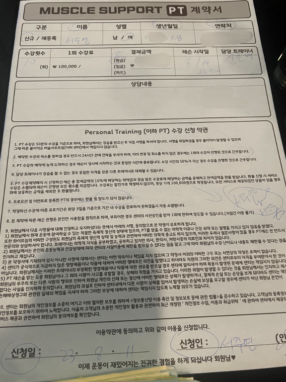 PT를 받아본 후에 느낀점은 운동을 시작할 때 받았으면 더 발전이 좋았을거라고 생각합니다. 어느 방향으로 갈지 어떻게 나아갈지 알고 가는거랑 모르고 가는거랑 다른거처럼 운동도 방향과 방식을 배우는게 좋은거 같습니다.