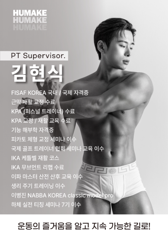 휴메이크에서 운동을 시작한지는 3년 6개월 정도 되었습니다 그동안 여러명의 트레이너님들과 함께 PT수업을 하였고 제가 유일하게 먼저 수업 신청을 한 트레이너님이 김현식 팀장님 입니다 올해 갑자기 허리 디스크가 심해져서 혼자서 어떤 운동을 해야 할지 난감해 하고 있을때 몸 상태를 고려하면서도 어느정도의 운동 강도를 유지하면서 수업 진행을 해주십니다 체형교정도 잘 되고 있습니다 항상 만족하면서 수업 합니다 즐거운 운동 할 수 있게 해주셔서 감사합니다.