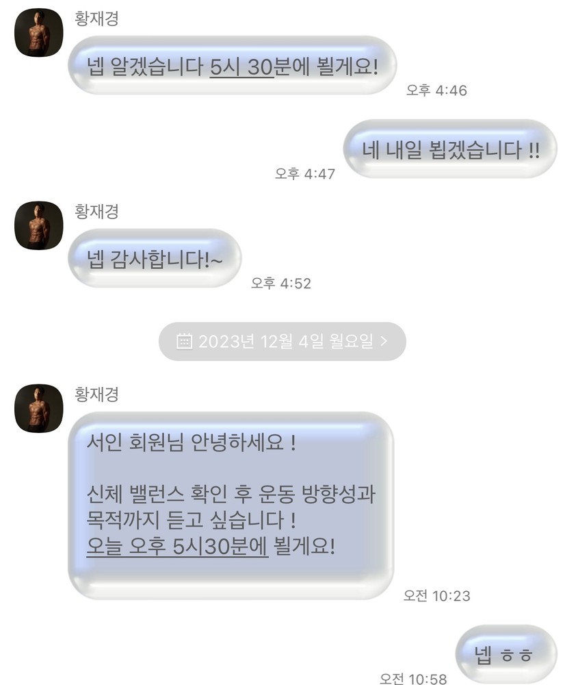 1개월정도 황재경트레이너쌤이랑 같이 운동했는데 너무 잘 알려주시고 저도 열심히 해서 몸이 좋아지는게 눈에 보일정도로 성장속도가 빨랐습니다 앞으로 1년동안은 같이 운동 할거같아요 몸에 맞게 운동 짜주시고 적절한 강도로 운동시켜주시고 하니까 정말 좋았습니다