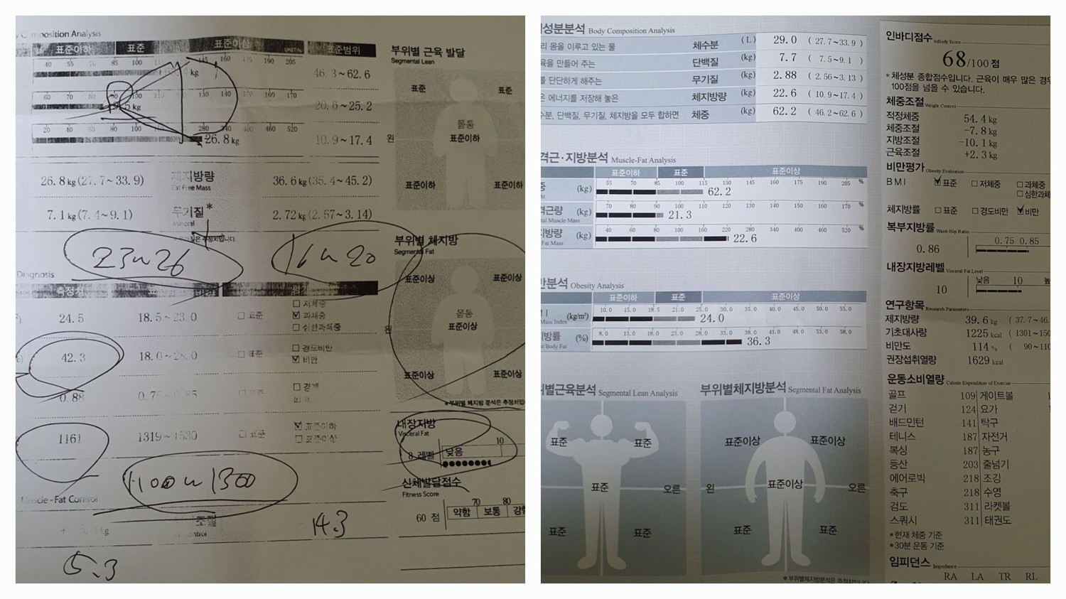 최종적으로 몸무게 7키로, 체지방율 10%, 체지방량 7키로 뺐고 준비기간이 남들 반타작이라 탄수를 줄이다보니 골격근량은 늘지 않을줄 알았는데 0.2 키로 늘었습니다! 체지방만 50일 안되는 시간에 7키로 뺀거죠. 앞으로는 잘 챙겨 먹으면서 운동 꾸준히하여 근육량 늘리고 싶은 생각이에요 ㅎㅎㅎ