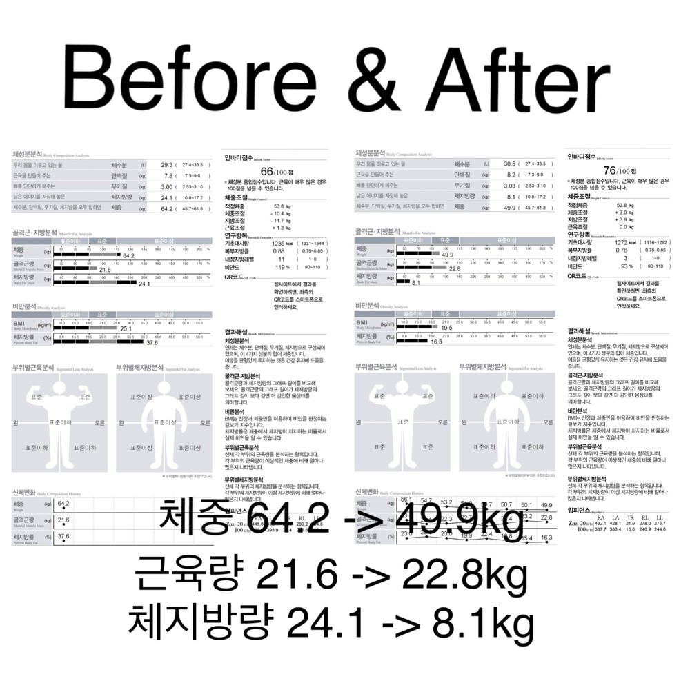 처음에는 단순 다이어트 목적으로 살만 빼려고 피티를 시작했는데 명현쌤을 만나고 항상 실패했던 다이어트는 물론 골격근량 늘리기까지 거뜬하게 진행중입니다!!