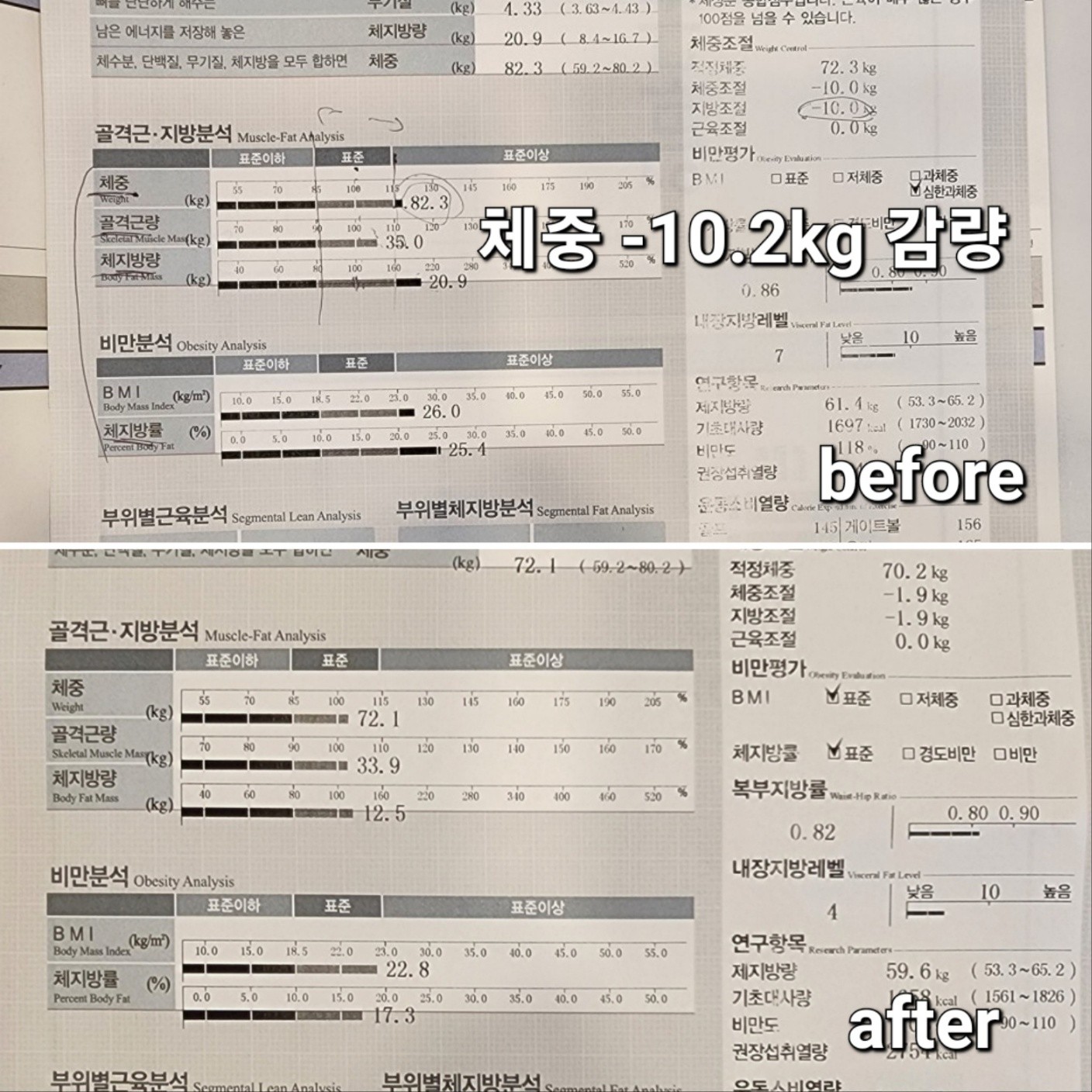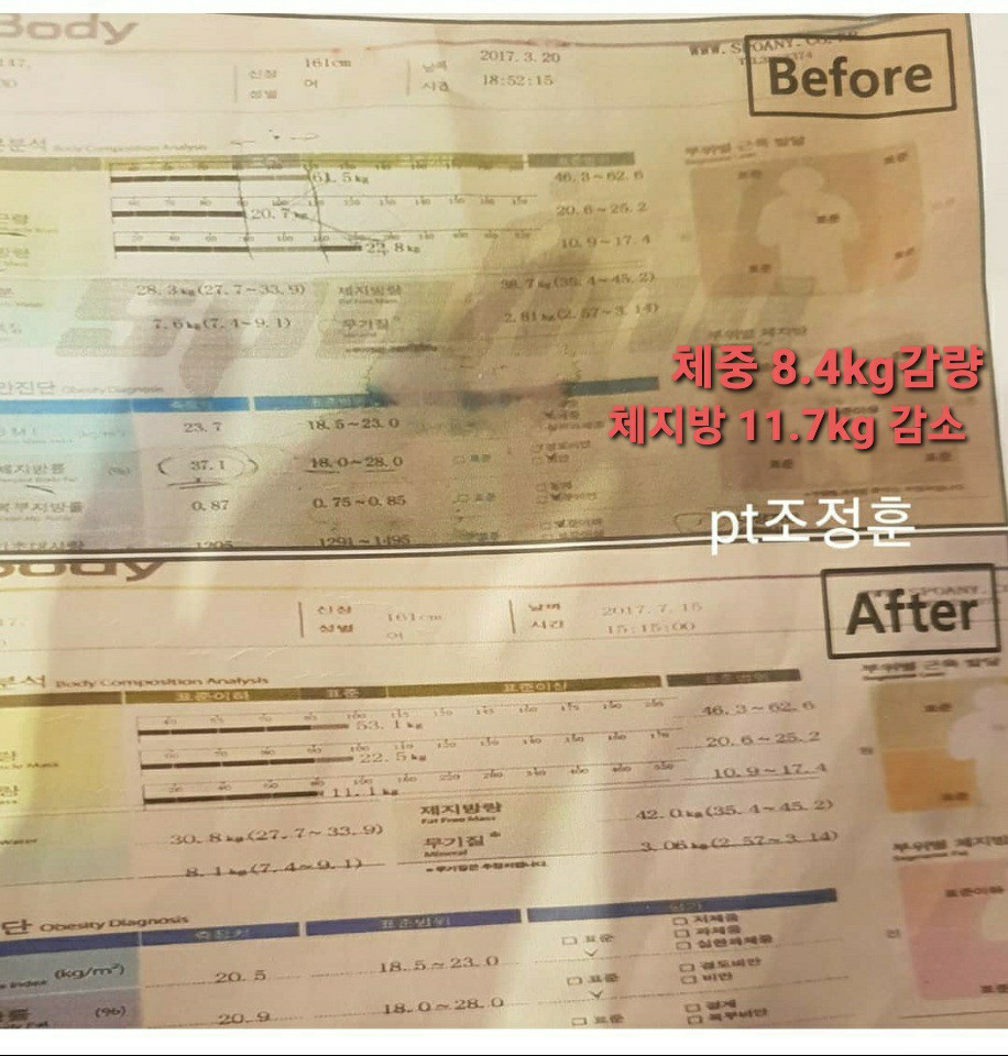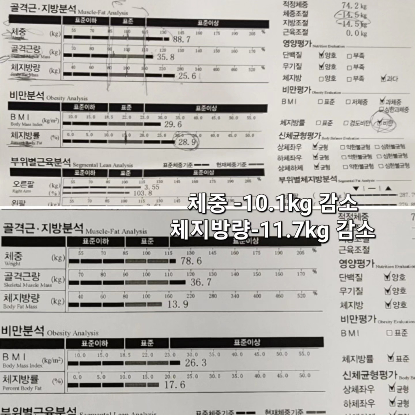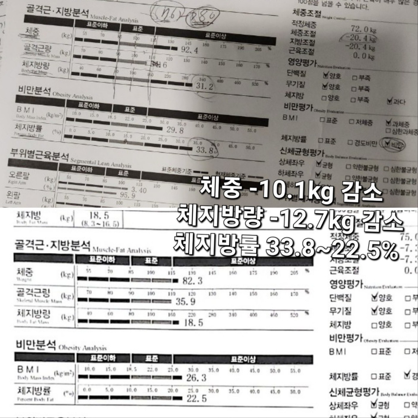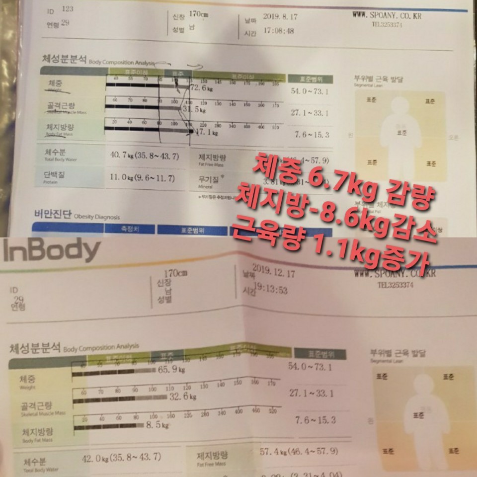 선생님께서 열정적으로 식단부터 세세한 운동 자세까지 지도해 주셔서 체지방량 8kg감량과 근육량 1kg증가 하였습니다