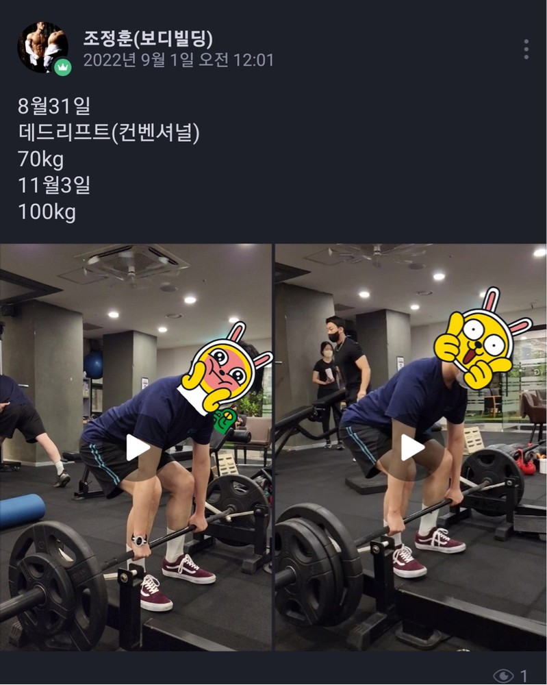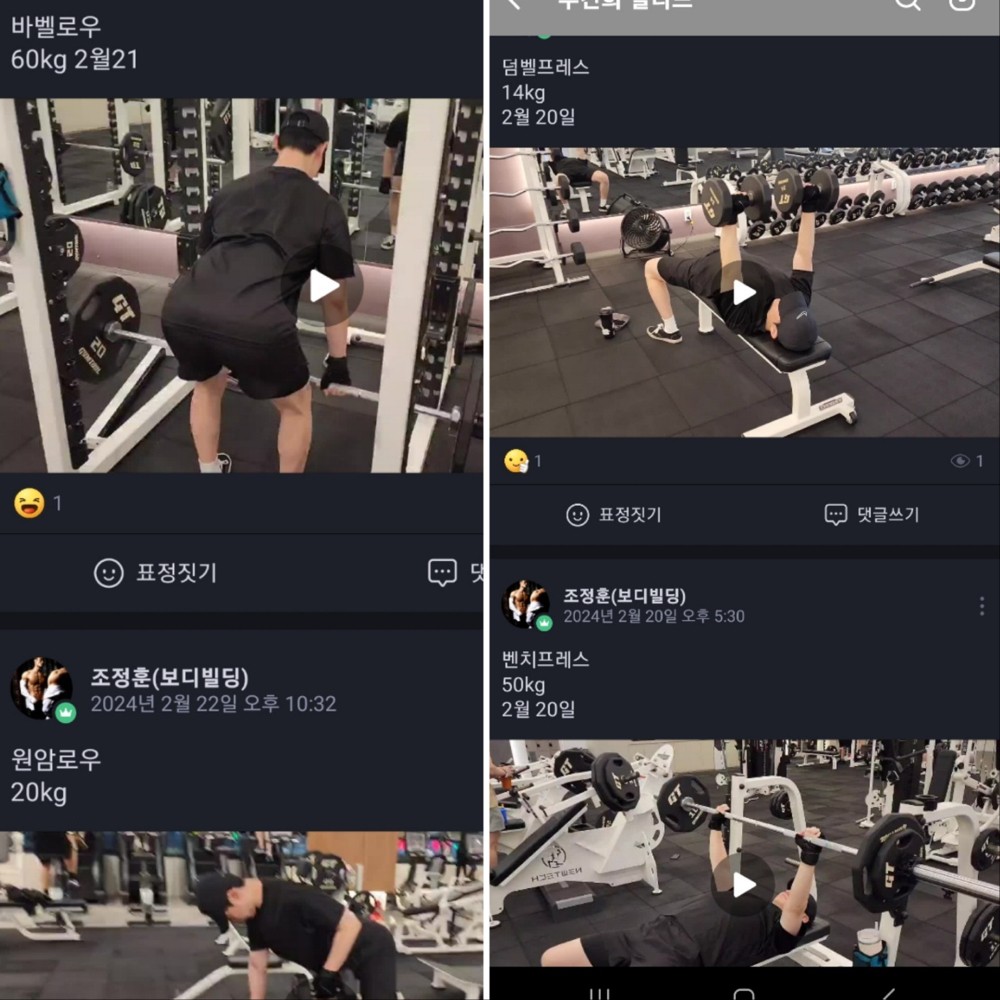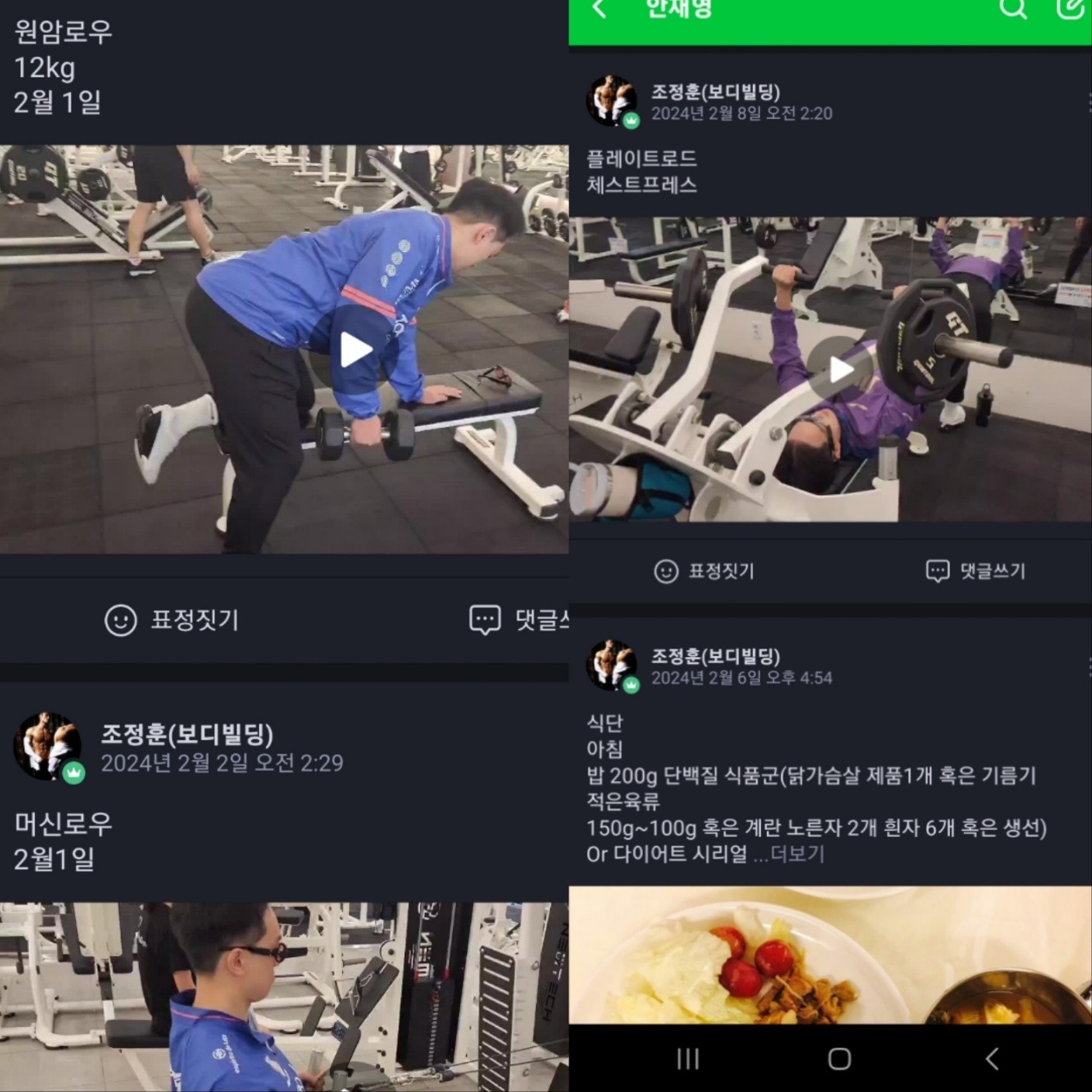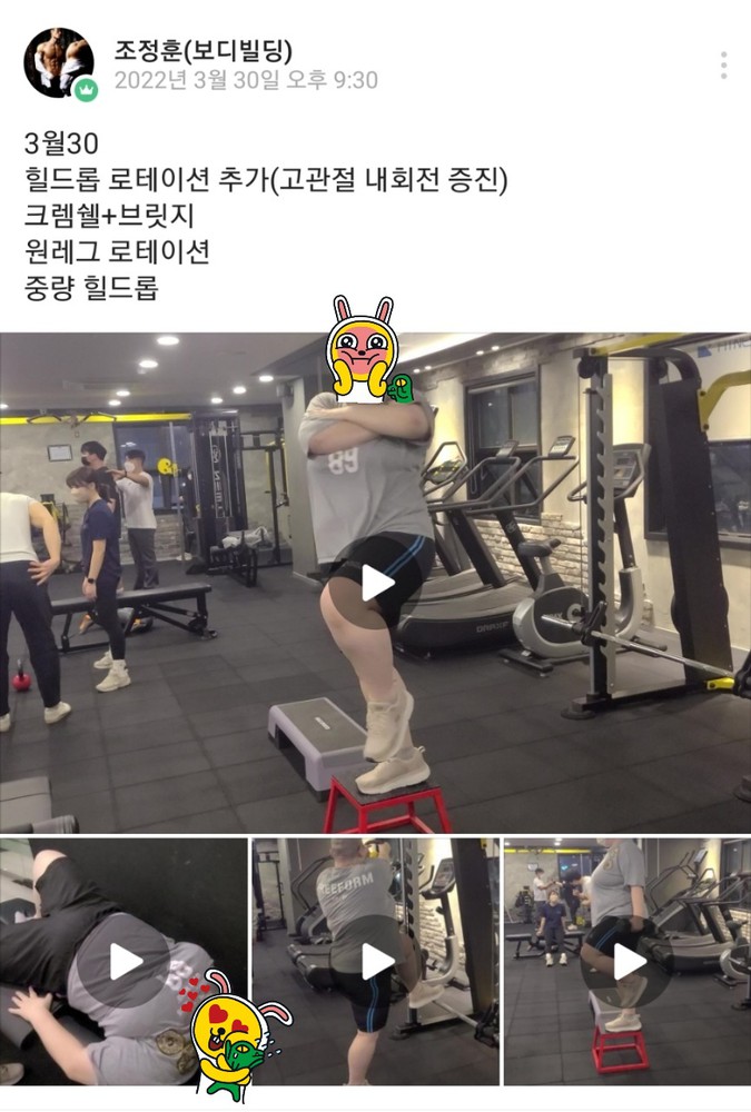 허리디스크로 인해 몸이 망가져 가는걸 느꼈고, 그전부터 운동의지는 있으나 계속되는 잔부상으로 혼자하는 운동에 한계를 느꼈습니다. 그때 가까운헬스장에서 조정훈쌤 만나게 되었고 지금은 나날이 강해져가는 몸을 피부로 느끼고있죠ㅎㅎㅎ 운동일지 꼼꼼하게 개인별로 작성해주시고 특유의 파이팅 넘치시는 에너지 덕분에 재밌게 운동하고 있습니다.