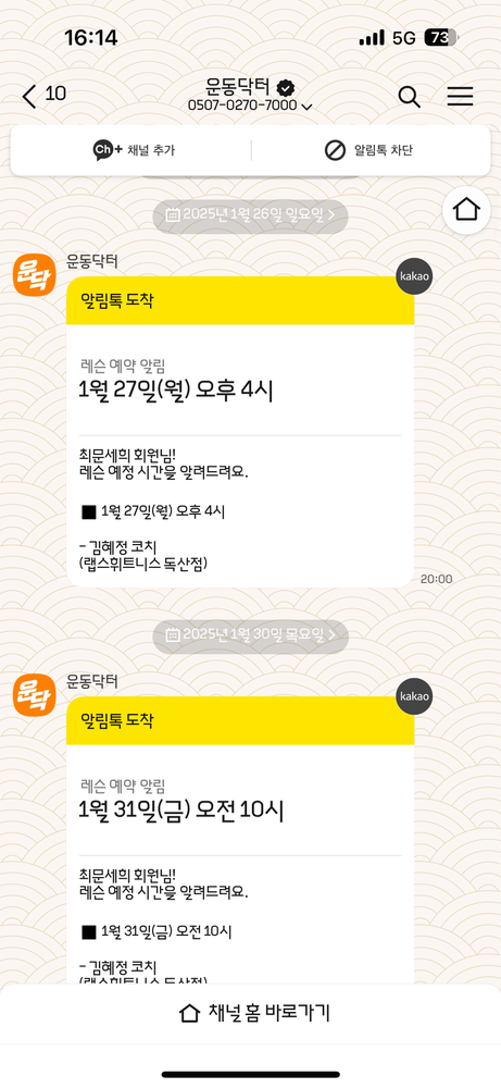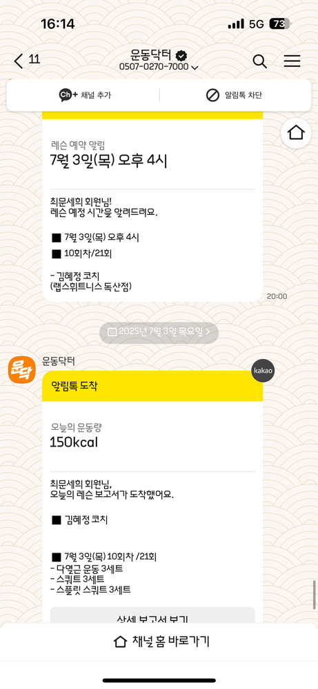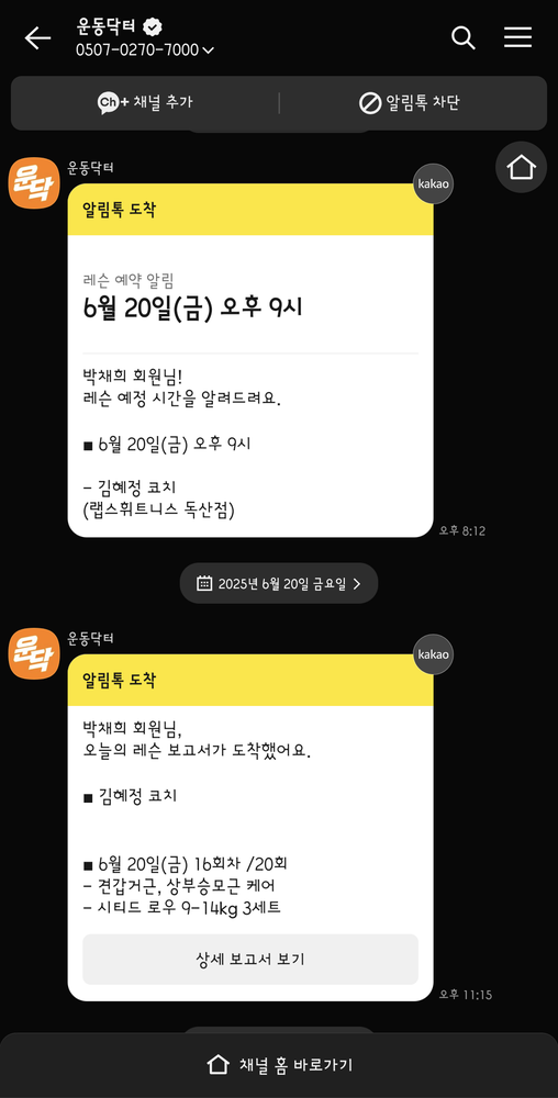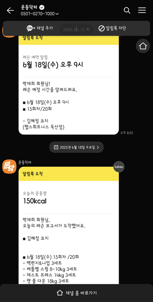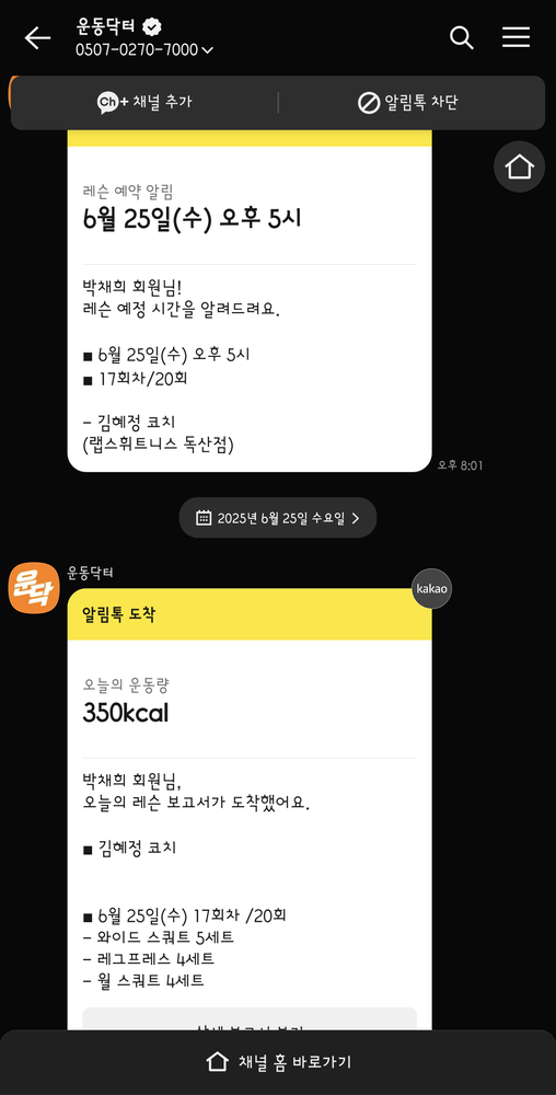 그리고 잊어버리지 않게 전날 알림도 오고, 피티 당일 했던 운동들, 소모칼로리도 카톡으로 알려주셔서