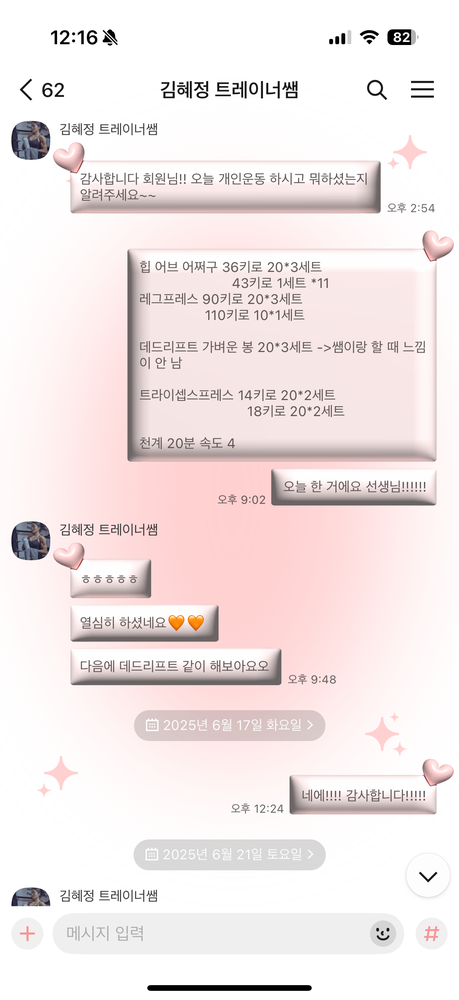혜정 트레이너님 덕분에 운동에 점점 재미를 붙이고 있어요! 원래 운동이랑은 정말 안 친했고 시작할 땐 체력도 약하고 자신감도 많이 없었는데 차근차근 알려주시고 자신감도 실어주셔서 덕분에 꾸준히 하게 됐어요ㅎㅎ 체력도 예전보다 훨씬 좋아지고 체형도 조금씩 예쁘게 잡히는 게 느껴져서 거울 볼 때마다 뿌듯해요! 감사합니다🩷✨
