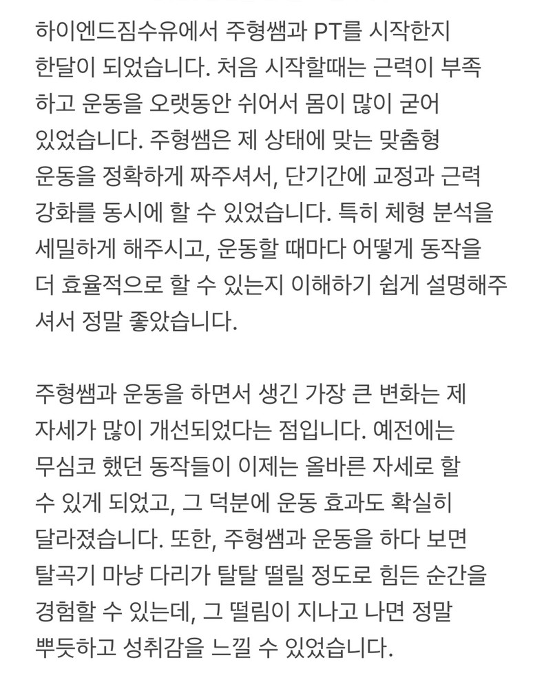 오랫동안 같이 운동하면서 신체의 변화도 많이 느꼈고요, 원래 계시던 헬스장에서 옮겨 가신 게 너무너무 아쉽습니다ㅠㅠ