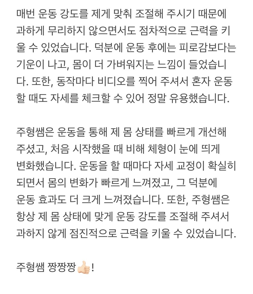 매번 운동 강도를 제게 맞춰 조절해 주시기 때문에 과하게 무리하지 않으면서도 점차적으로 근력을 키울 수 있었습니다.덕분에 운동 후에는 피로감보다는 기운이 나고, 몸이 더 가벼워지는 느낌이 들었습니다.또, 동작마다 비디오를 찍어 주셔서 혼자 운동할 때도 자세를 체크할 수 있어 정말 유용했습니다.
