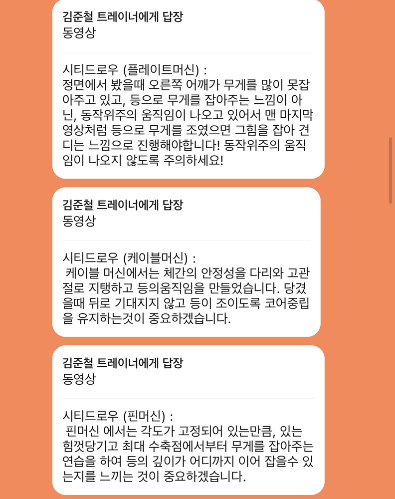 항상 PT 끝난 후에 동영상이랑 자세 피드백을 보내주셔서 개인운동때도 참고하면서 운동하니까 너무 편하고 좋습니다!