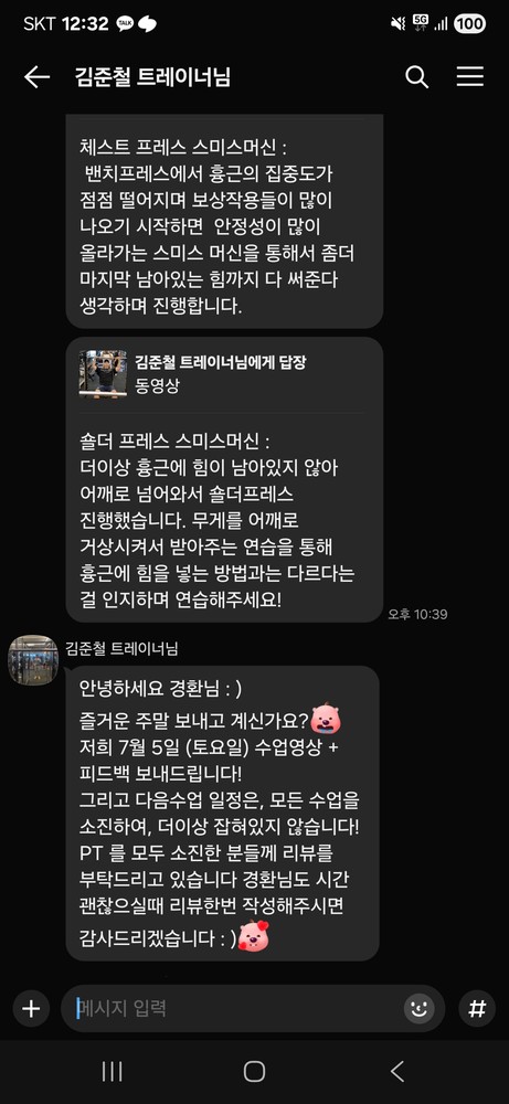수업 후에는 운동영상 및 자세와 도움이 되는 스트레칭 피드백까지 챙겨주셔서 개인운동때도 참고해서 운동할수 있다는 점이 좋습니다. P.t를 처음 하시는 분들께는 친절하고 열정적인 김준철 트레이너님을 강력하게 추천합니다!