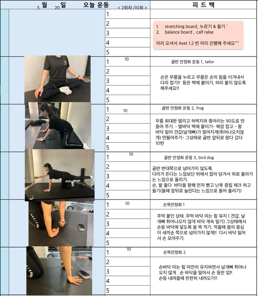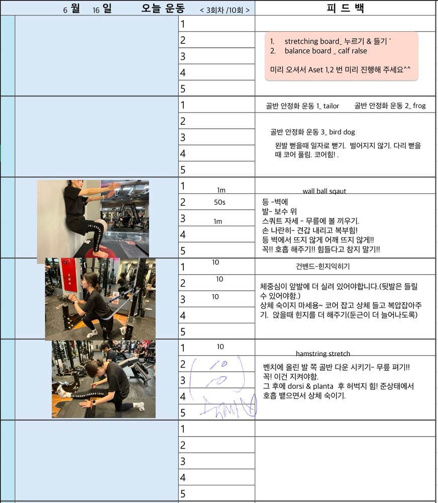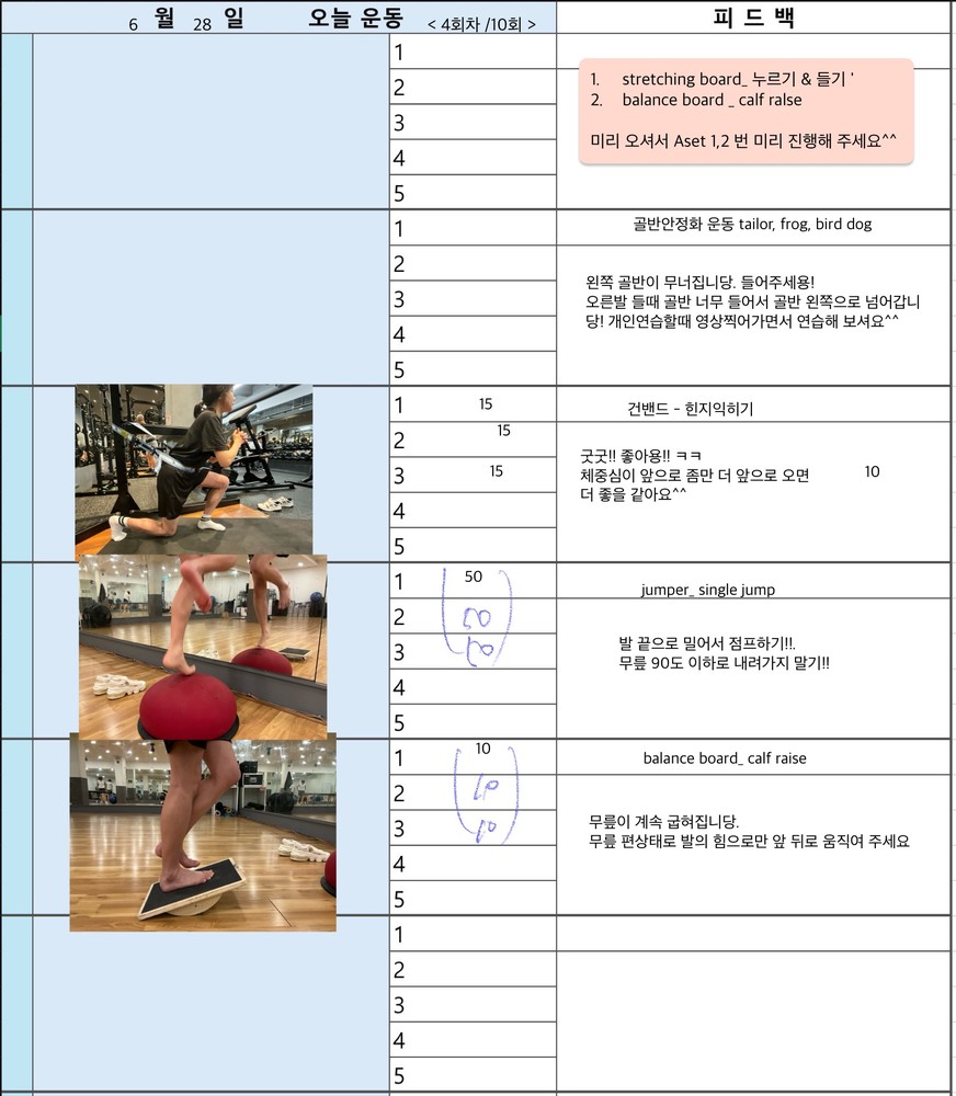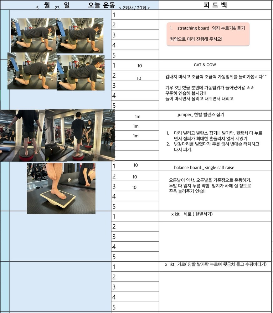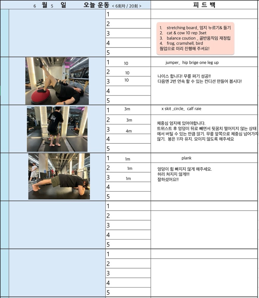 보통 수업 있는 날 아침에 어떤 운동할지 미리 보내주시고 피 티 후 그날 바로 피드백 일지를 보내주십니다. 피드백 보면서 개인운동도 할 수 있어서 혼자 운동하는 것도 어렵지 않아 좋습니다~ 안전하게 몸의 균형 잡아가며 운동하길 원하신다면 예지쌤 강추입니다!!