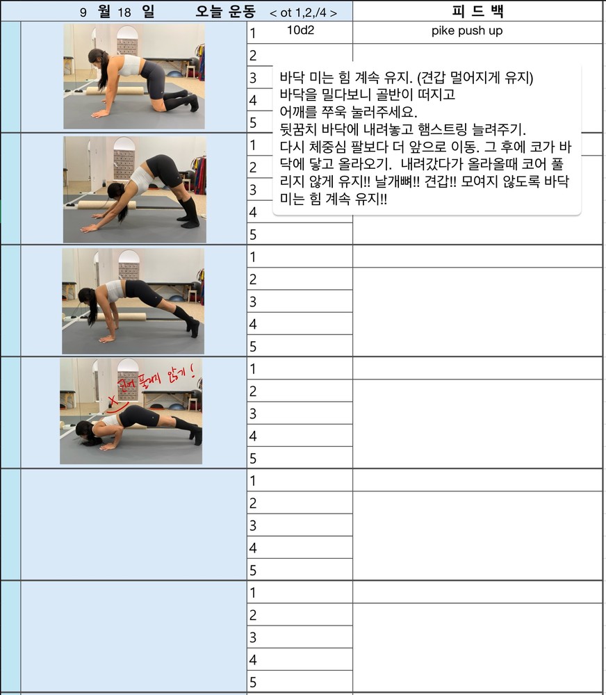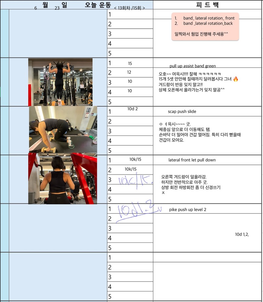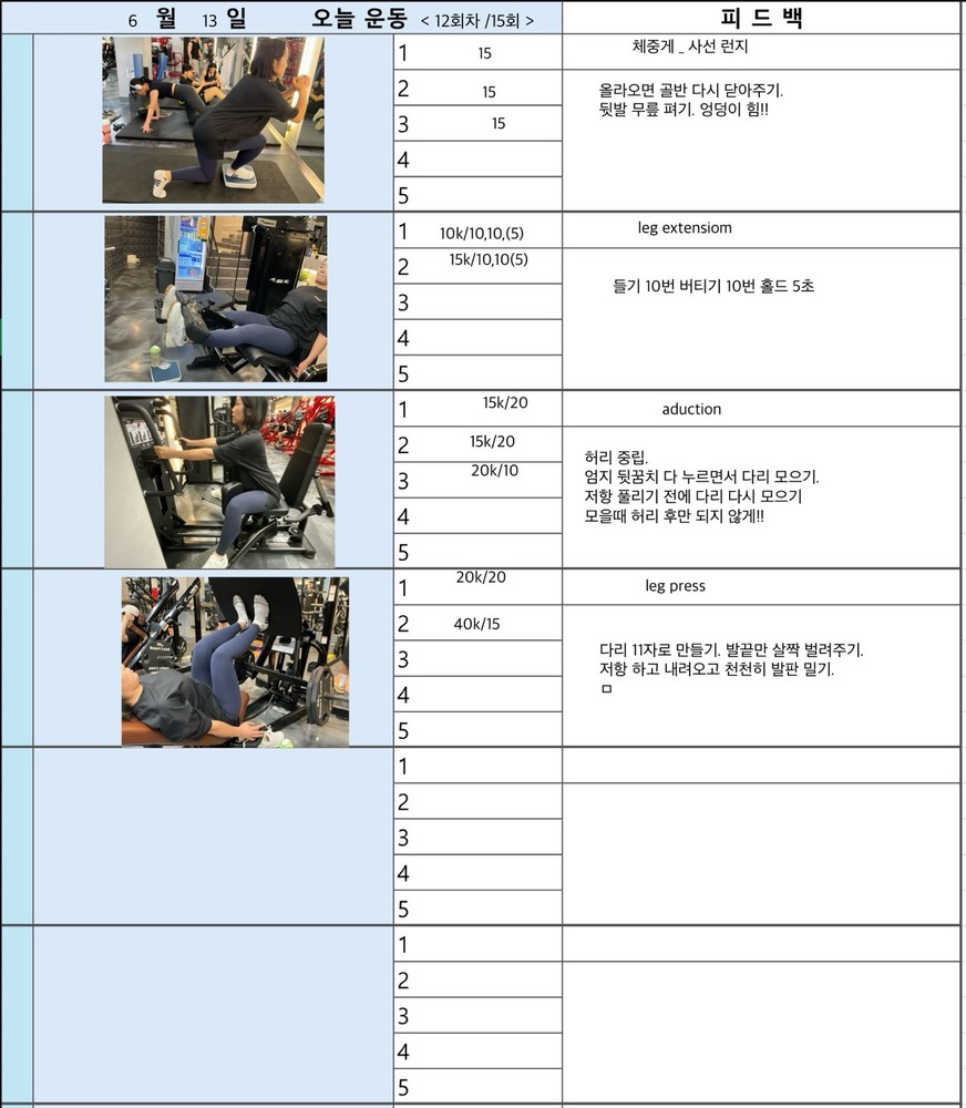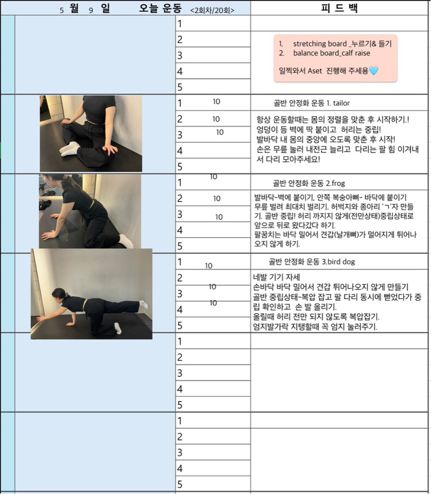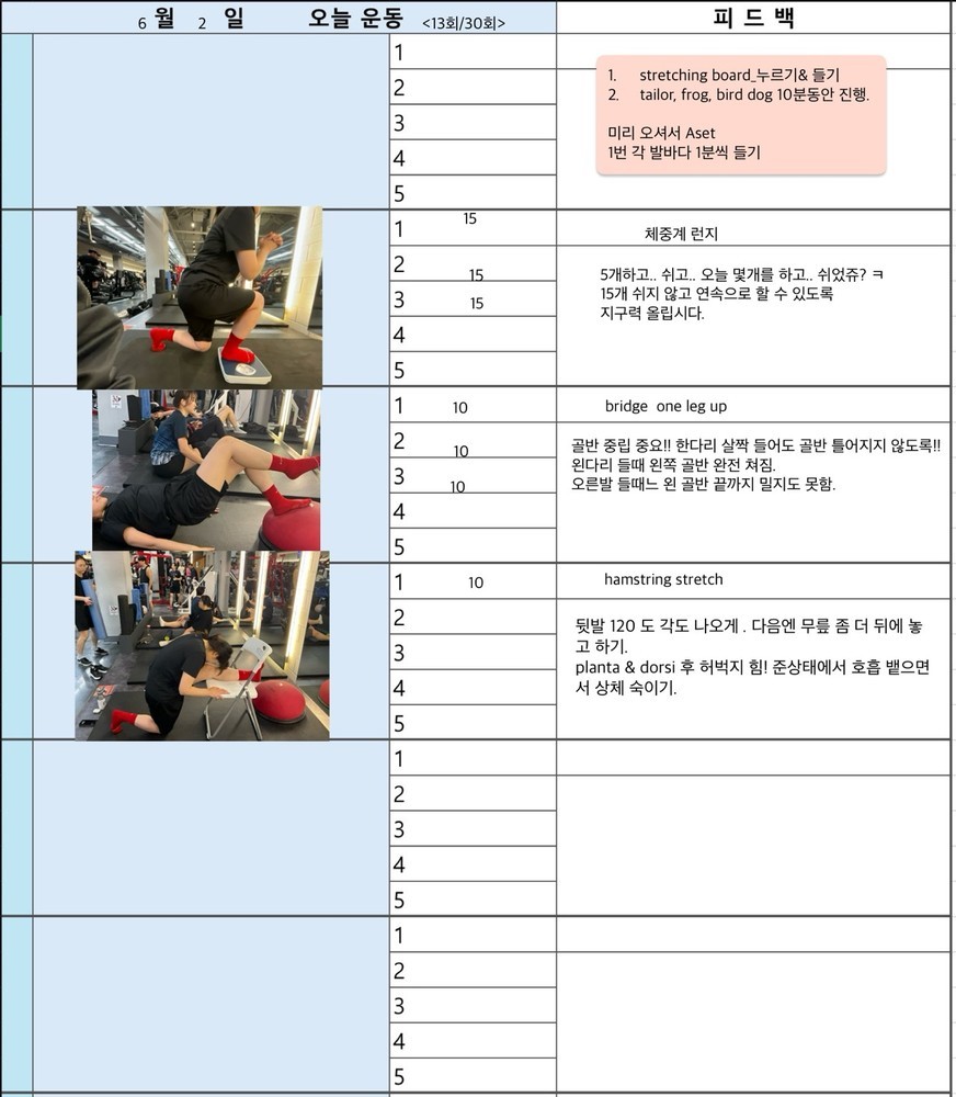 보통 수업 있는 날 아침에 어떤 운동할지 미리 보내주시고 피 티 후 그날 바로 피드백 일지를 보내주십니다. 피드백 보면서 개인운동도 할 수 있어서 혼자 운동하는 것도 어렵지 않아 좋습니다~ 안전하게 몸의 균형 잡아가며 운동하길 원하신다면 예지쌤 강추입니다!!
