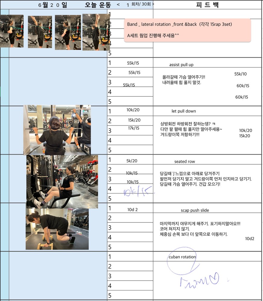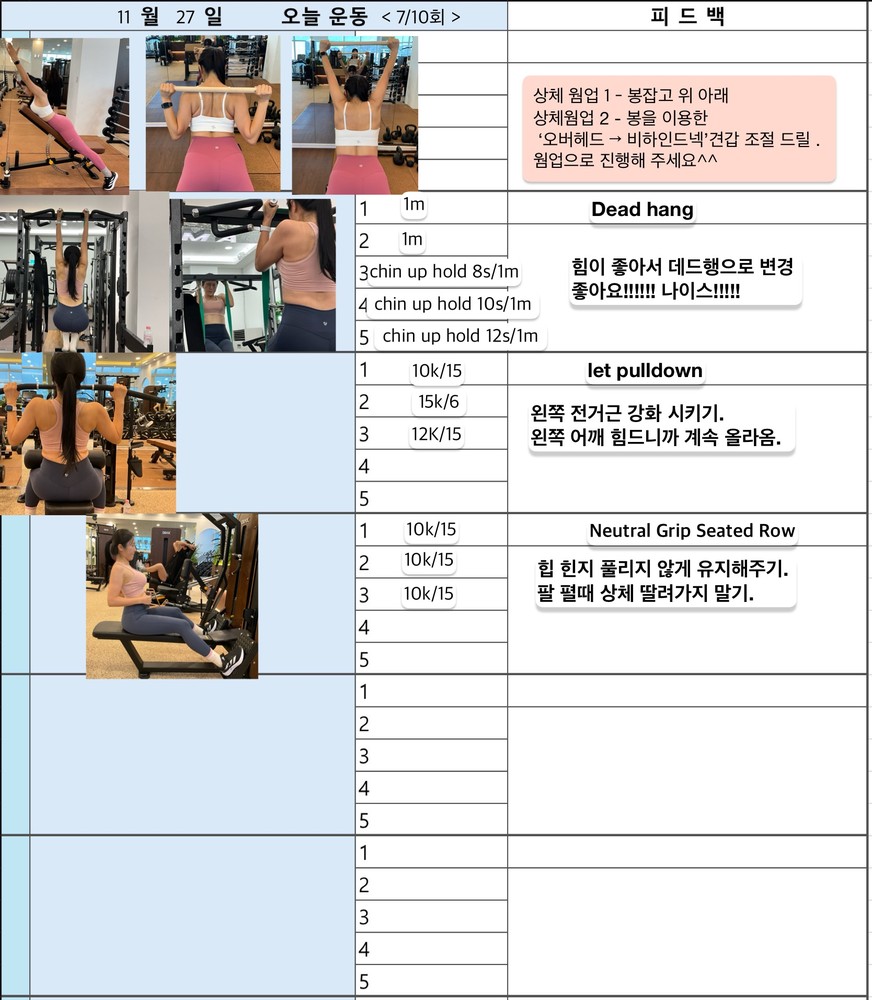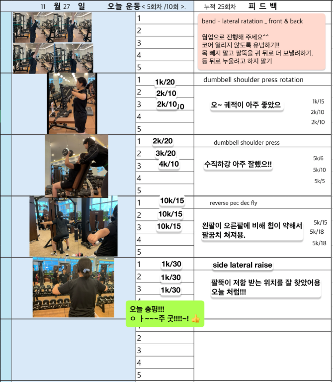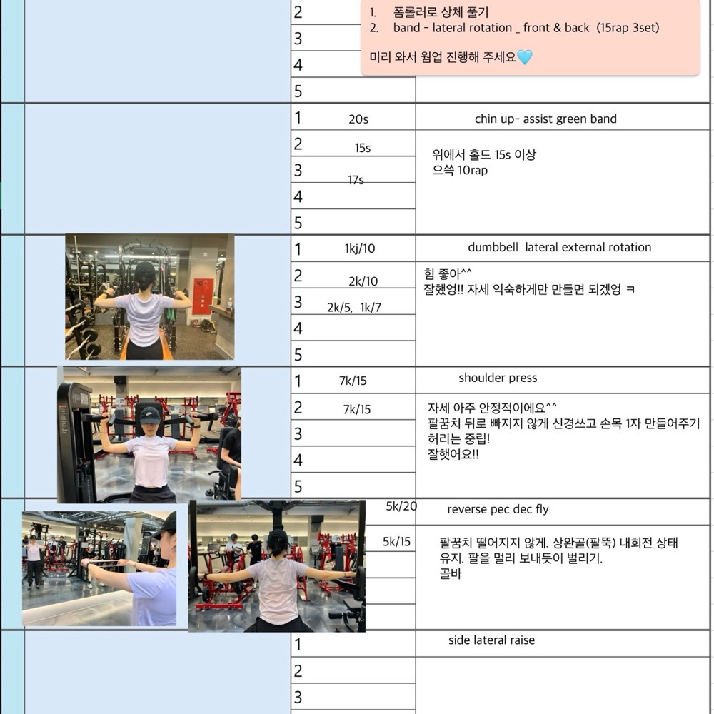 처음엔 어깨 좌우 불균형으로 리버스 펙덱플라이도 제대로 못했는데 지금은 좌우 균형 맞게 운동 수행 하시는 유정님 보면서 아주 뿌듯했답니다^^ 앞으로도 지금까지 운동했던거 처럼 운동 하시면 더 좋아지실꺼에요!!