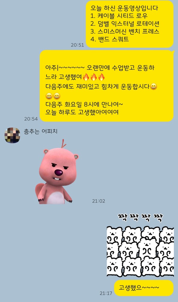 매 수업마다 새로운 동작도 배우시지만, 이전에 배운 운동들을 점점 더 잘 해내고 계셔서 앞으로 변화가 더 기대됩니다.