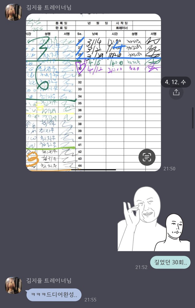 두 번째는 쌤에겐 운동을 하게 만드는 묘한 매력이 있습니다..! 식단이든 운동이든 크게 부담을 주시진 않지만 카톡으로 안부도 물어봐주시고 그 열정을 보며 저도 열심히 하고싶어지더라구요. 동기부여 그 자체랄까..