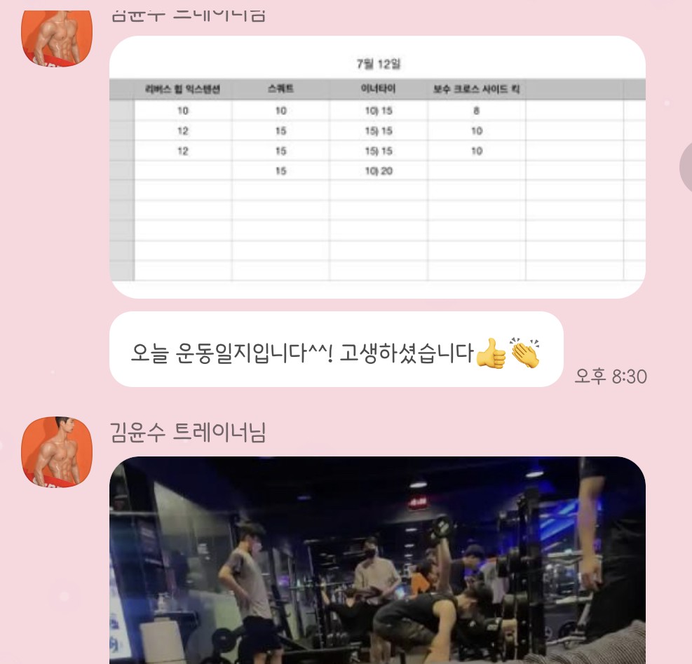 그리고 제가 지구력이 안 좋은 편이라 개인운동 때엔 갯수나 세트수를 채우기 힘들어했는데 쌤과 수업하면 서브해주시고 격려해주셔서 개인운동보다 훨씬 운동효율이 높았어요.