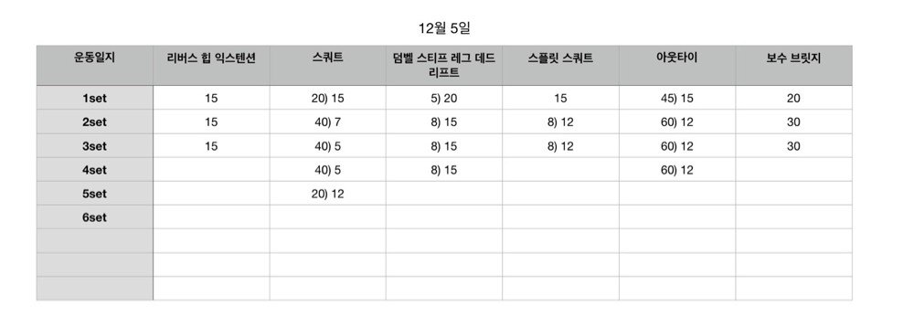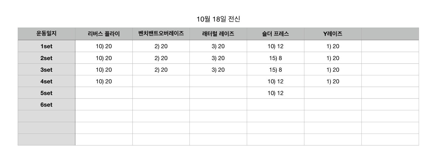 특히 윤수쌤은 매번 운동 영상을 찍어주시고, 표로 운동 일지를 정리해 주시는 점이 엄청 큰 도움이 되었어요! 하루에 어떤 운동을 했는지, 무게는 얼마로 했는지 다시 확인할 수 있어서 개인 운동할 때 정말 도움이 많이 되었답니당 완전 추천해요👍🏻💪🏻