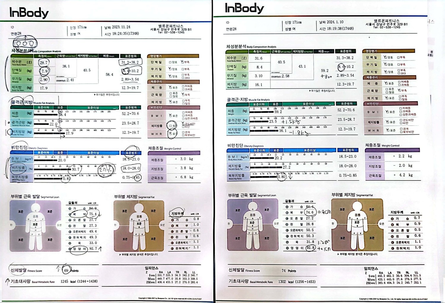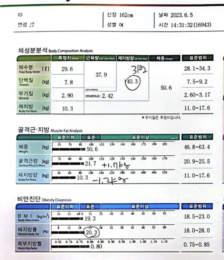 사실 식단이나 운동이 느슨해질 때도 있었지만 알려주신대로 열심히 하다보니 한달이 지났고 근육량 1.5kg증가, 체지방 1.8kg감소했습니다!