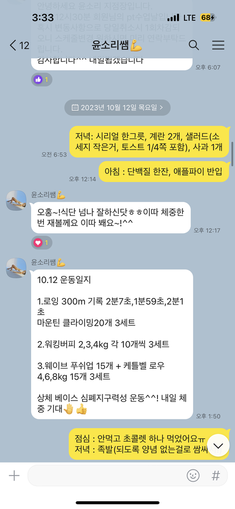 그리구 쌤이랑 운동할 때마다 양질의 운동은 물론이고 건강에 대한 꿀팁까지도 얻고 오네용ㅎㅎ 매일 식단에 대한 피드백도 길~게 해주시고 레슨 끝날 때마다 그날의 운동일지도 아주 자세하고 꼼꼼하게 보내주십니다! 그거 보고 개인 운동 때 복습할 수 있어서 넘 좋아용😍