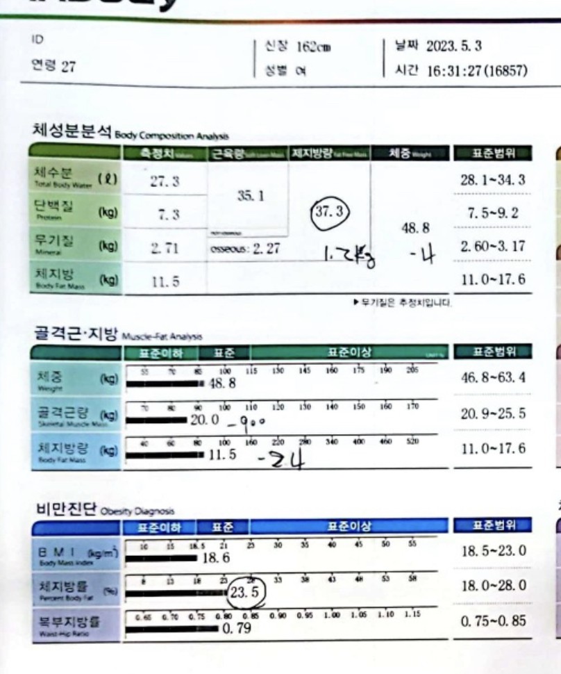 결론부터 말하자면 2월 19일 키 168cm 체중 66.5kg 체지방률 33.3%으로 시작해서 6개월 뒤 체중 52-3kg 체지방률 21-2%까지 도달했습니다. 그리고 pt가 끝나고 2달이 지난 지금도 체중 52-54kg, 체지방률 23%대로 유지 중이지요.