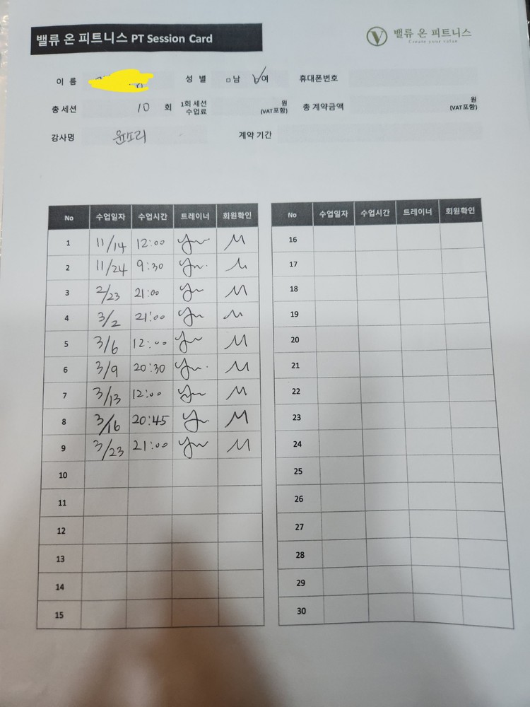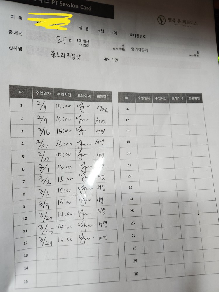 피티 결제하기 전에 좋은 선생님을 고르기 위해 네군데 정도 1회 체험을 돌았고 결론부터 말씀드리자면 윤소리 선생님으로 30회 결제했습니다!