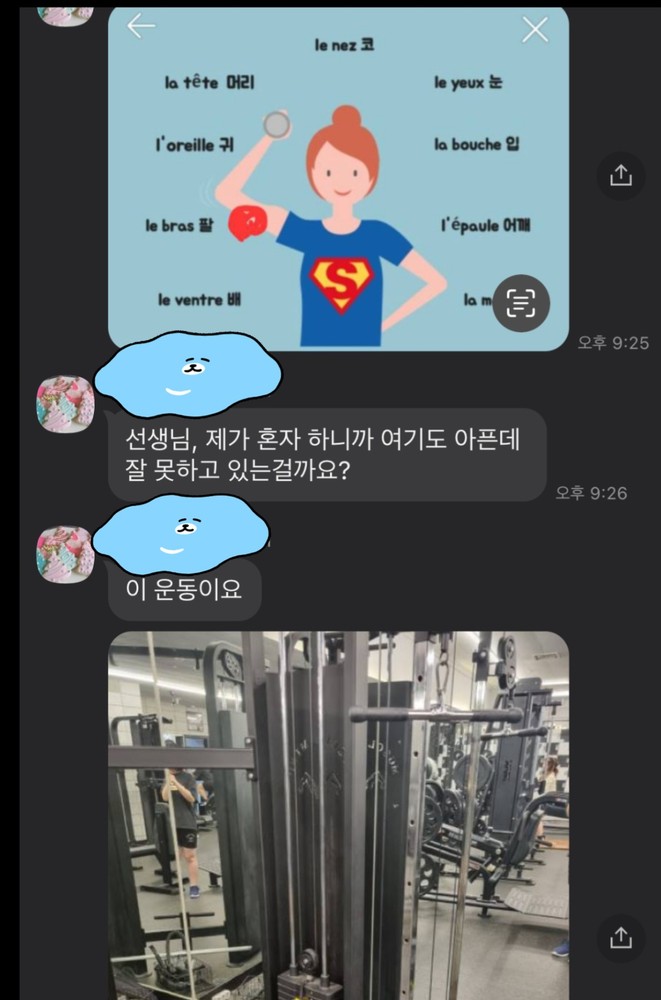 동작 하나하나 자극점과 디테일한 부분까지 이해하기 쉽게 알려주시고 그날그날 뭐했는지 카톡으로 보내주셔서 혼자 운동할 때도 생각하면서 하게되더라구요ㅎㅎ