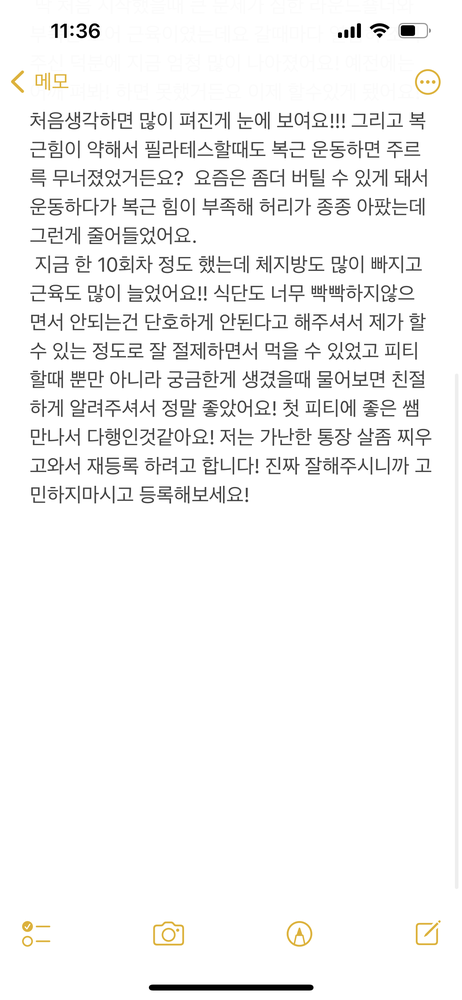 피티 하기전에는 다들 좋다고하니까 그게 그렇게 좋나..?이런 느낌이고 가격이 망설여지는 가격이잖아요? 그런데 해보니까 왜 비싼지 알겠더라구요… 진자 좋아요 몸이 확실히 건강해졌어요 추천추천합니다 후기는 사진에 더 있어용