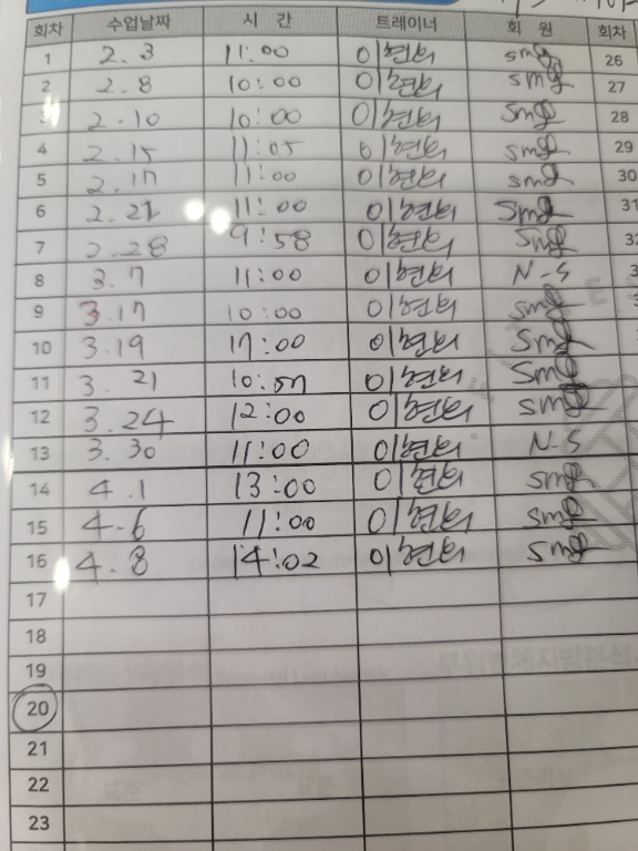 의지부족이라 혼자선 운동 절대 안 하는데 페이스에 맞게 자세도 꼼꼼히 봐주시고 으쌰으쌰해주셔서 늘 즐겁게 수업받고 있습니다🥹🩷 시작한지 얼마 안 됐을 때에 비해 나름 체력 붙은 게 느껴져요!!!! 전에 개인운동 나왔을 때 쌤이 너무 감동하셔서 앞으론 개인운동도 조금씩 나와보려고 합니당 ㅋㅋㅋㅋㅋ 빠이팅~~!!!