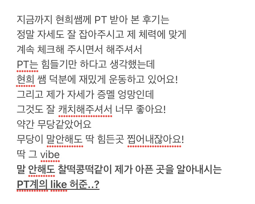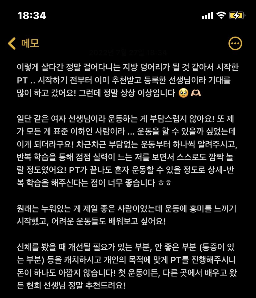 운동을 해야겠다는 생각은 있었지만 pt 받는 것에 대해 막연한 두려움이랑 부담감이 커서 줄곧 미뤄왔는데 현희쌤은 개인별 상황에 맞게 운동할 수 있도록 세심하게 신경써주시고 영양적으로 식단까지 살펴주셔서 생각한 것 보다 훨씬 도움 많이 받고 있어요! 그동안의 제 생활패턴이나 몸이 불편했던 점들을 제가 말씀드리도 전에 쌤이 바로 알아봐주시는게 너무 믿음이 가서 처음 수업받으러 간날 바로 30회 등록하고 운동하는 중입니다. 현희쌤과 오랫동안 꾸준히 운동해서 건강한 몸을 만들고 싶어요!