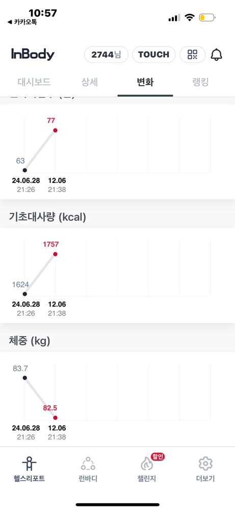 4개월정도 운동후 검사결과, 체지방은 7킬로 줄고, 근육량은 4킬로 증가하였습니다.