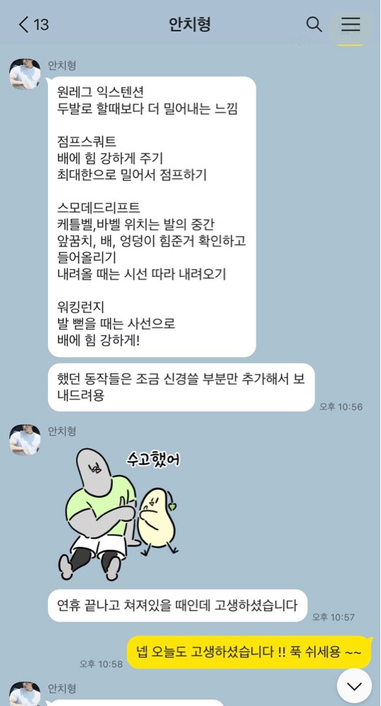 매주 아침일찍 스케줄밖에 안되서 아침에 수업을 부탁드려도 힘든내색 없이 끌어주시고 수업도 아닌데 바디체크 해주시고, 촬영날까지 동행에 고생했다고 밥까지 사주는 그는 천사,,