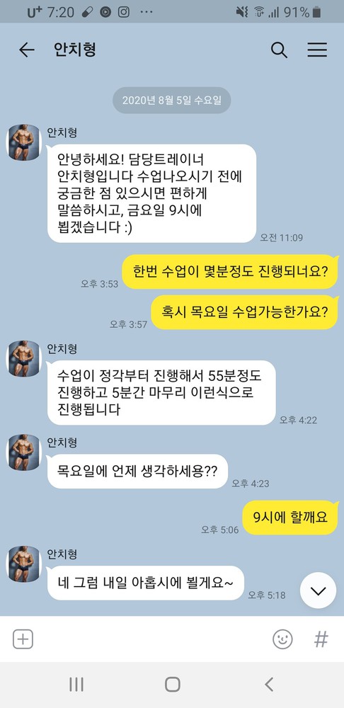 여러곳의 PT를 받아봤지만 너무 무리하거나, 체계적이지 못하거나, 소홀한 느낌이 들거나 하는 등의 이유로 재등록을 하지 않았지만 선생님 만나고는 운동하는게 거부감이 없고, 편하고 체계적으로 몸이 변하는걸 느껴서 꾸준하게 운동하는 중입니다! 감사해요 !몸도 운동하는 마음도 변하게 해주셔서! 알라뷰요