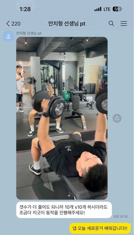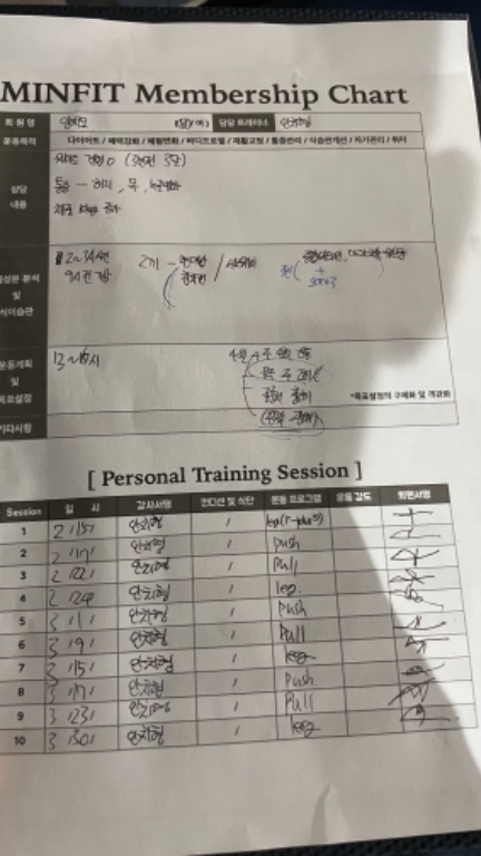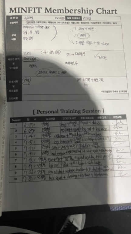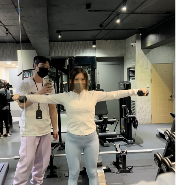 혼자서 영상의 도움을 받아 운동을 해오다 근육 성장이 더딘 것 같고 다른 부위도 도전해 보고 싶어서 pt를 신청하게 되었어요.