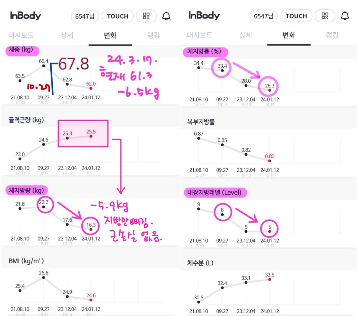 일이 많아지면서 잠으로 대체할수 없을정도로 체력이 안좋아졌는데, 치형쌤 만나서 운동 제대로 배우고 소중한 워라밸도 지켜가는 중이네요. 수치상으로도 꾸준히 근성장 되는게 보이고 뿌듯합니다:) 앞으로도 잘부탁드려요 쌤~