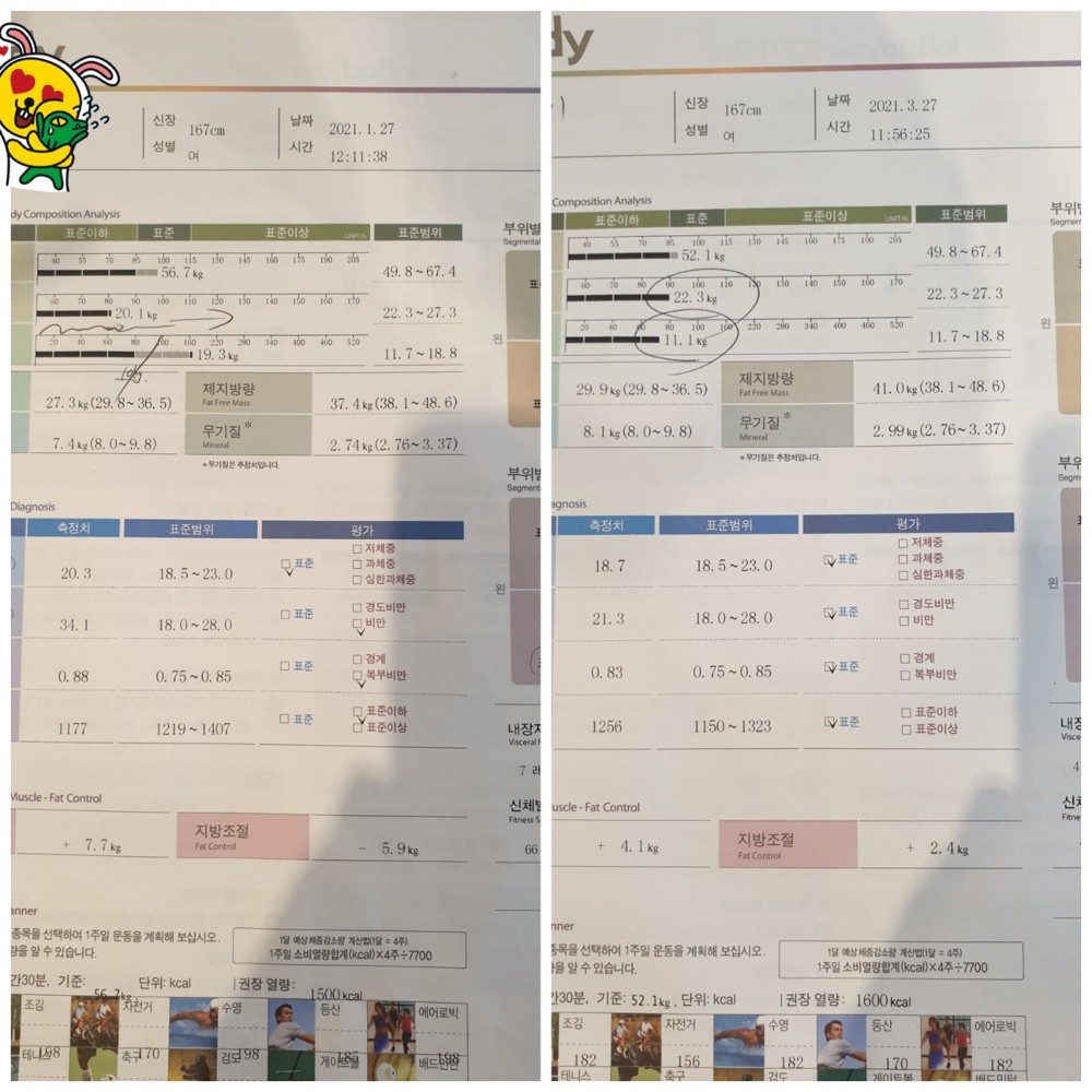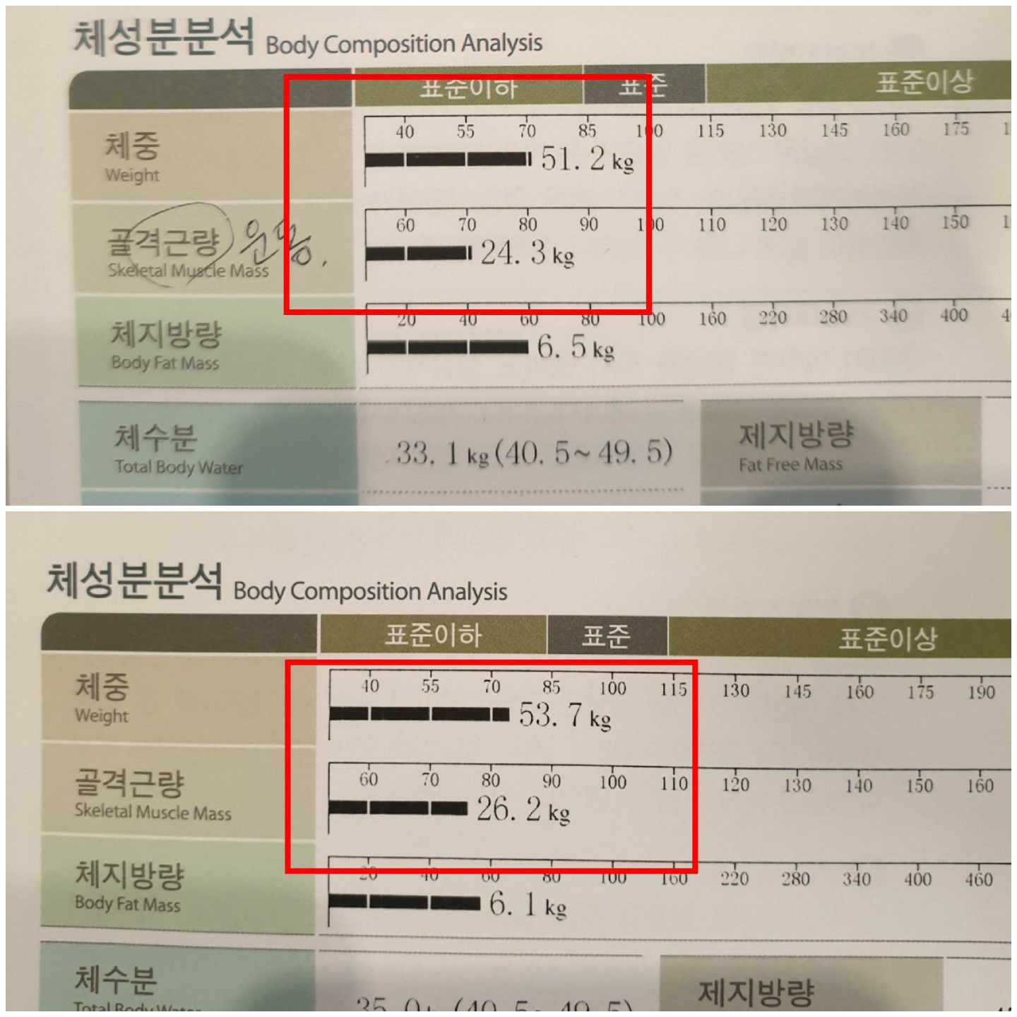 결과는 전체적으로 아주 좋아졌어요. 체중과 근육량도 늘었고 한개도 하지 못했던 턱걸이도 이제는 올라간답니다.