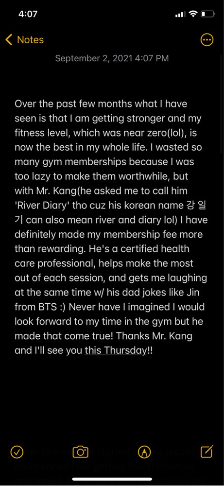 후기를 적으랬더니 일기를 쓰는 기분이긴 한데, 요약하면 일기쌤은 운동에 재미를 붙일 수 있게 도와주실 수 있는 분이고, 운동 부위나 방법 등에 대해 자세히 알고계십니다!