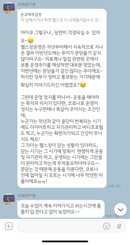 코로나때문에 운동을 못나간 적도 많았는데 잘 지내는지 친절히 연락도 가끔 주셨고 항상 웃는 얼굴로 맞아주시고 긍정에너지를 팍팍 불어 넣어 주셔서 즐겁게 운동 할 수 있었어요. P.T를 지금도 하고 있지만 점점 건강해지고 있어서혜림팀장님께항상감사합니다.
