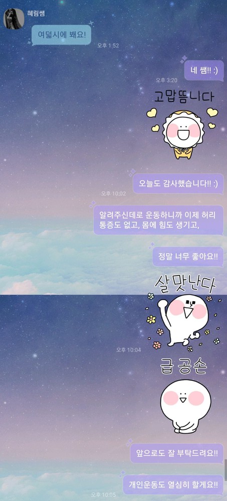 덕분에 허리 통증과 골반 통증이 많이 사라졌습니다:) 앞으로도 피티는 혜림쌤께만 받을 것 같아요!!