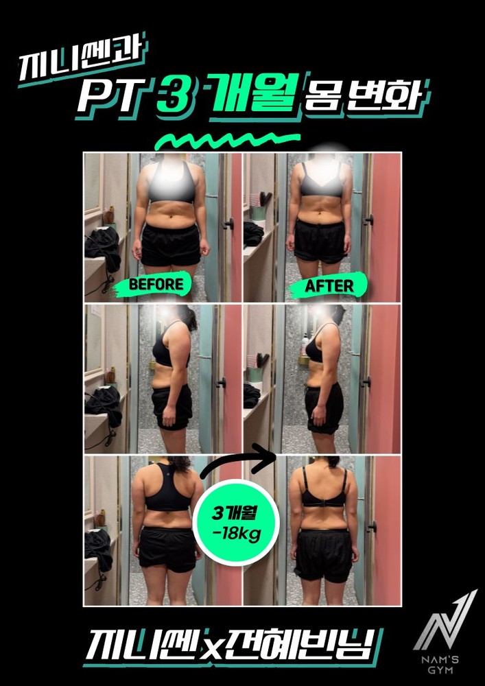 지니쌤께서는 체계적인 관리와 개개인의 체력수준에 맞도록 PT를 정말 잘 진행해 주셨습니다. 그덕인지, 정말 운동과는 담을 쌓고 살던 제가, 점점 운동의 재미를 알아갈 수 있었습니다. 그렇게 결국 지니쌤과 함께한 6개월이라는 시간 동안 약 29kg 감량에 성공하였습니다.