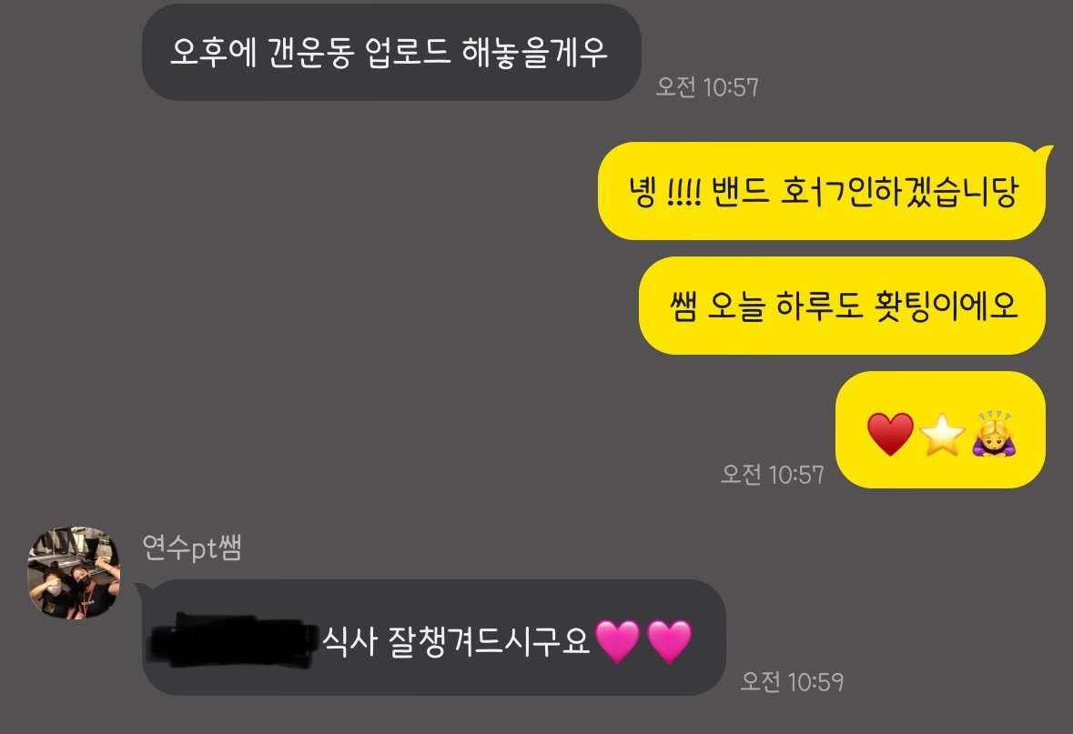 여러 피티를 받아봤지만 연수쌤만큼 열심히 해주는 쌤 못봤어요👍 ㅎㅎ 운동할 때 어느 부위에 자극이 와야하는지, 어느 부분에 더 신경을 써야하는지 꼼꼼히 체크하고 봐주십니다!! 피티하고 끝이 아니라 밴드를 통해 오늘 어떤 운동을 했으며, 어떤 부분이 부족한지 항상 꼼꼼히 기록해주시니까 개인 운동할 때도 놓치지 않고 더 열심히하게 되더라구요!!!! 매번 영상 찍고 밴드 올려주시는게 번거로우실텐데 그만큼 신경써주신다는 느낌을 받아 더 열심히하게 됩니다!!💪 연수쌤 쵝오🥹👍✨💖