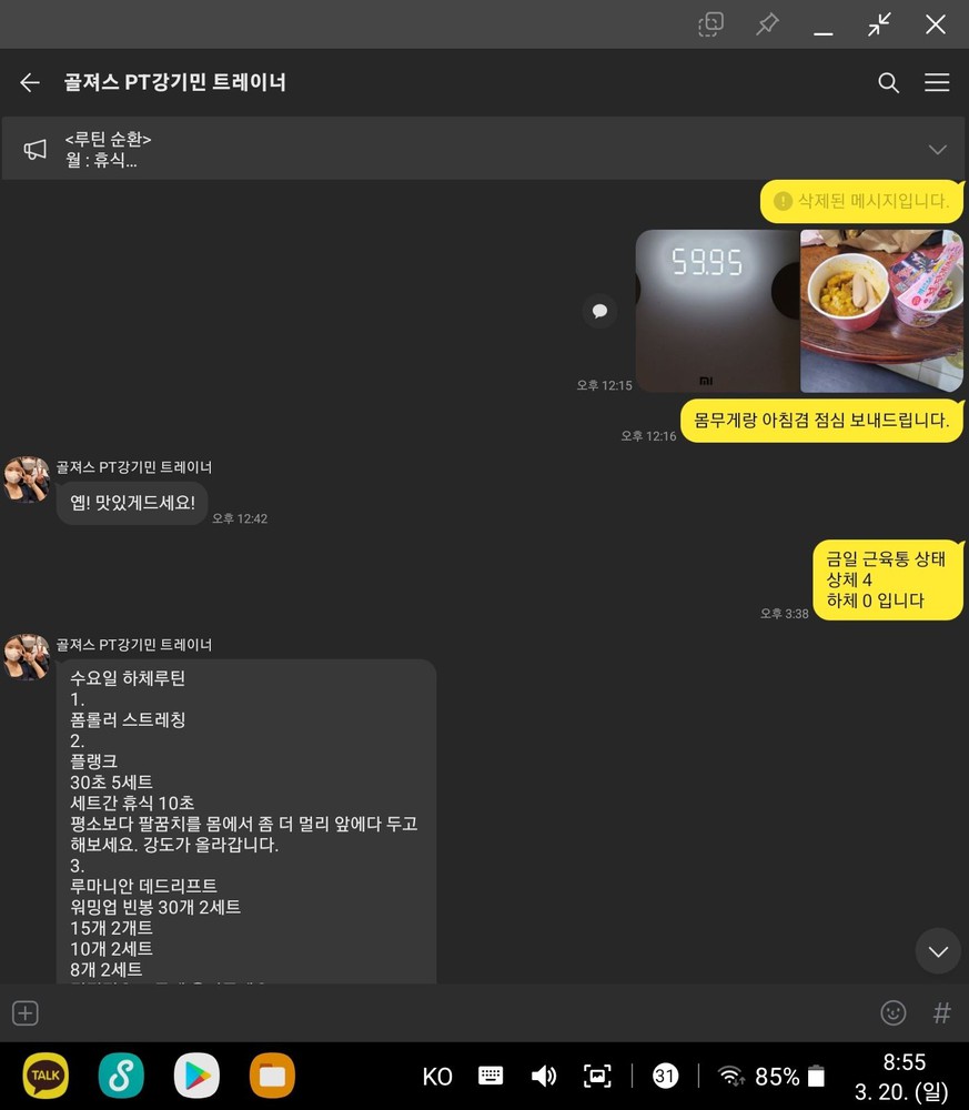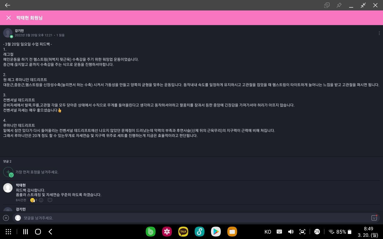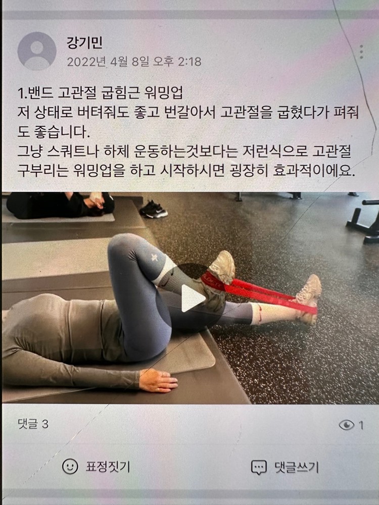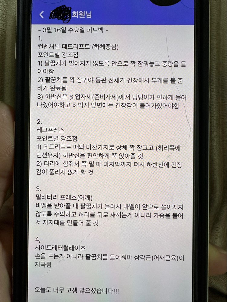 운동순서와 기초적인것부터 잘 알려주셨고 (준비운동,스트레칭,자세교정 등)아픈부분이 있으면 어느부분이 문젠지 자세교정 하나하나 다해주시고 정말 진심으로 회원분들을 생각하시는게 느껴집니다 !! 그리고 영상을 찍어서 자세하게 다 적어서 올려주시는데 이것도 너무 감격..🫢