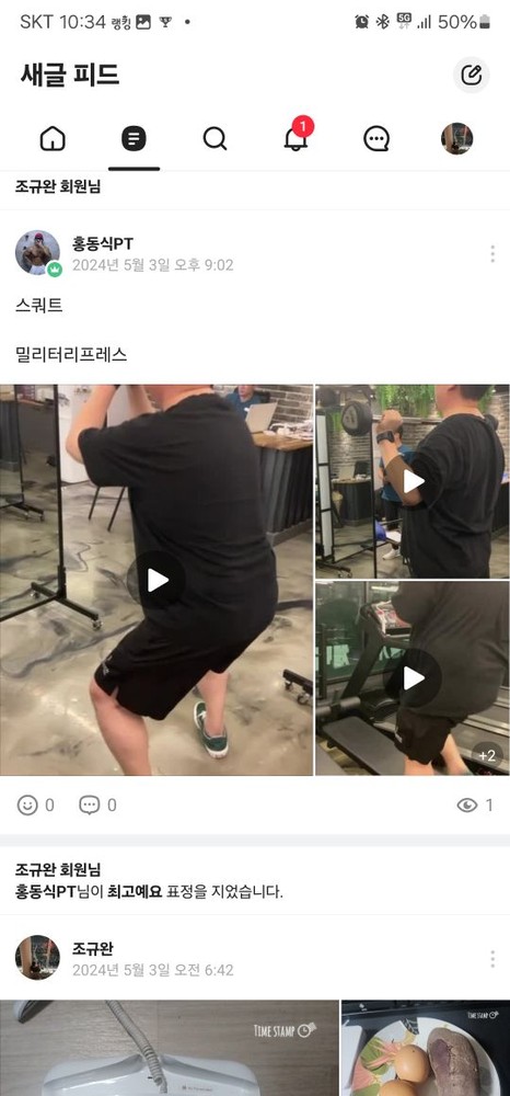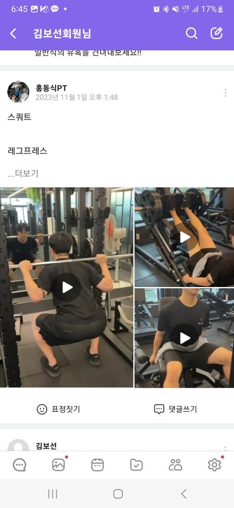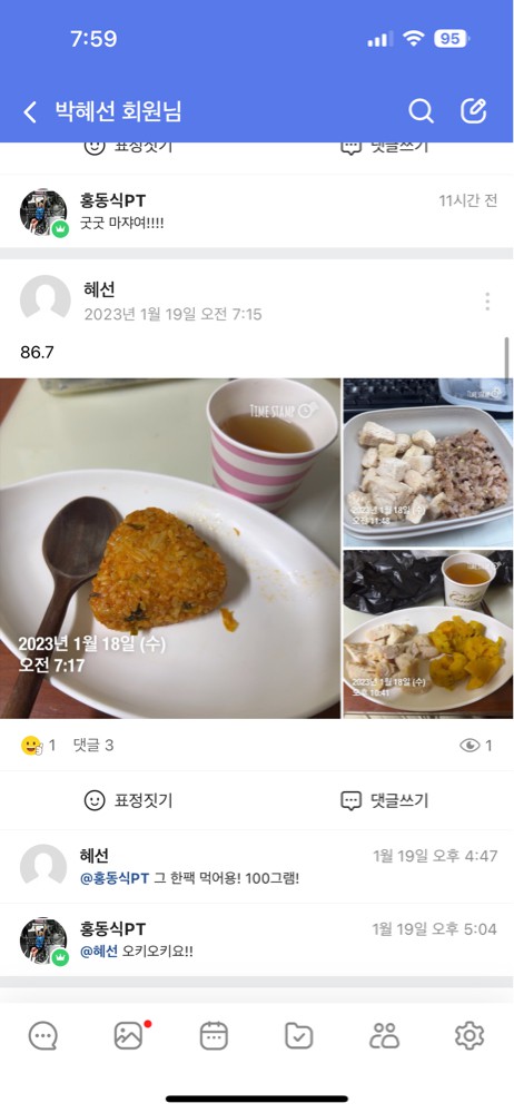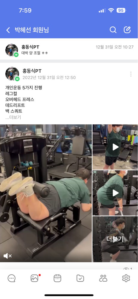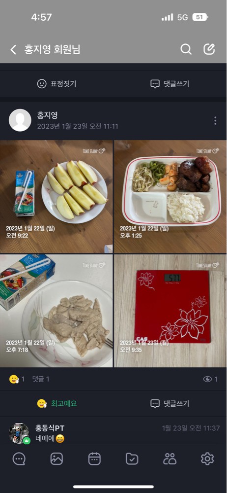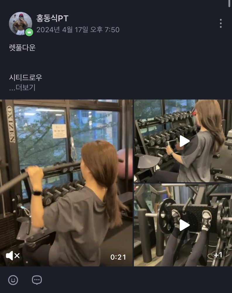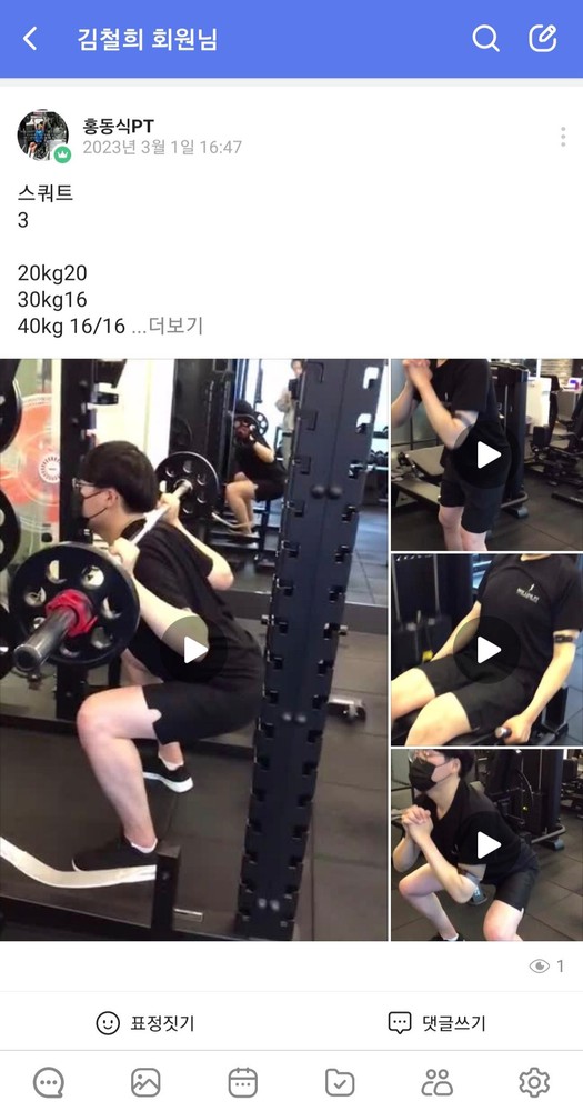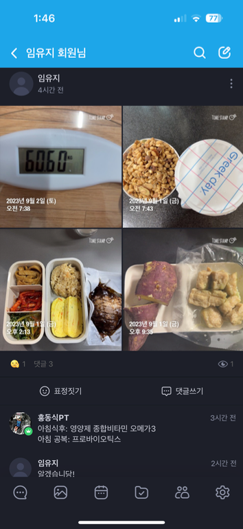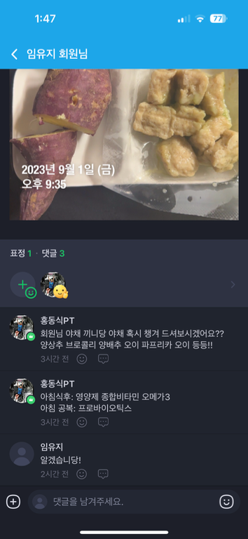 선생님께 지도받은지 한달정도 된 회원입니다! 홍동식 선생밈 장점은 가능한 운동강도를 최대한 끌어내주십니다 워치 채우시고 심박수가 허용하는 선에서 최대한 운동강도를 뽑아내주셔서 제가 혼자 운동할때 좋은 기준이 됩니다 또 자세가 잘못되거나 다른부위에 통증이 느껴질때 꼼꼼하게 이유 설명해주시고 자세 다시 시범보여주셔서 효율적으로 운동 하고있습니다. 또 위에 사진처럼 식단관리 피드백도 매번 해주시고 꾸준히 동기부여를 해주십니다. 항상 웃으시면서 편하게 대해주시고 수업 없는날에 혼자 운동하고 있는모습을 꾸준히 보고계셨다가 수업때 피드백도 해주십니다 정말 회원분들한테 많은 관심을 가지고 계십니다 매일아침마다 공복 몸무계 체크하시며 유산소 강도도 조절해주십니다 이 선생님이랑 운동하시길 정말 추천드려요 ㅎㅎ