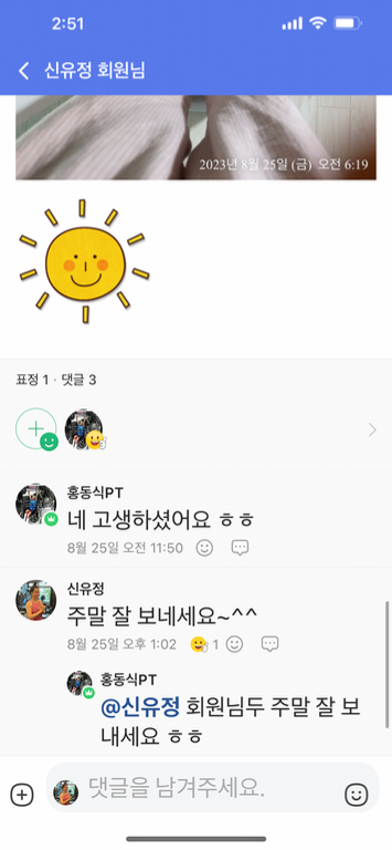 트레이너 쌤한태 피티받은지 2주 좀 넘었네요 직장다니면서 붙은 살이 절대 안빠질줄 알았는데 조금씩 몸에 변화도 보이고 여자친구도 아주 좋아라 하네요. 운동하는 재미를 알아갑니다. 앞으로도 잘 부탁 드립니당^^!