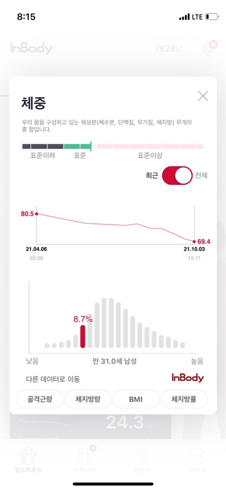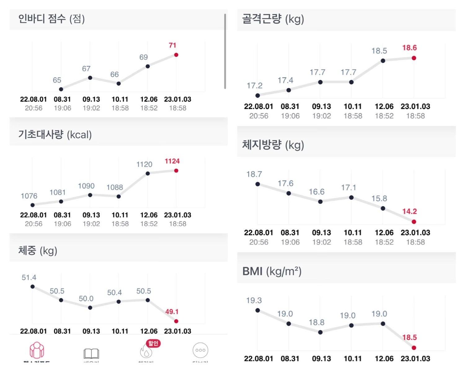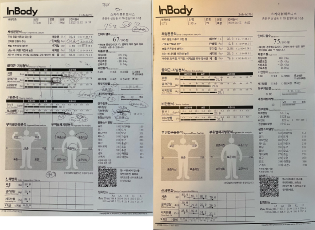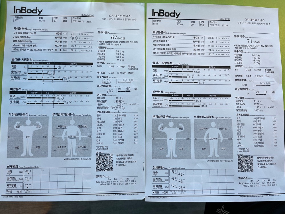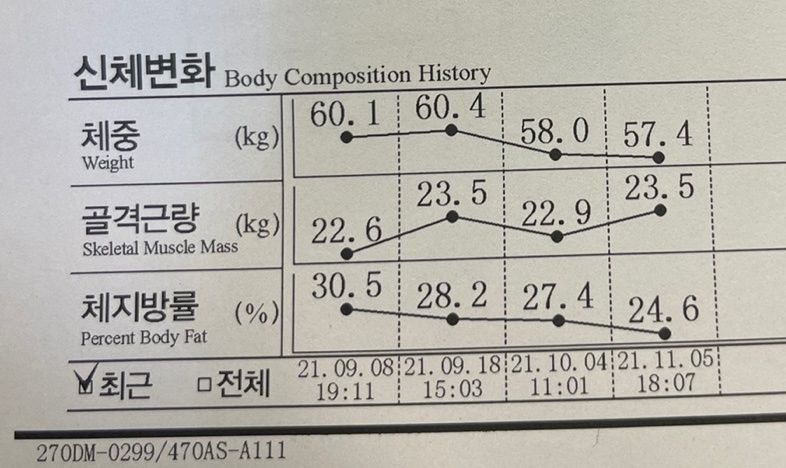 처음이랑 비교했을때 근육량 손실 없이 체지방만 6키로 감량 넘 신기해요ㅎ 감사합니당!