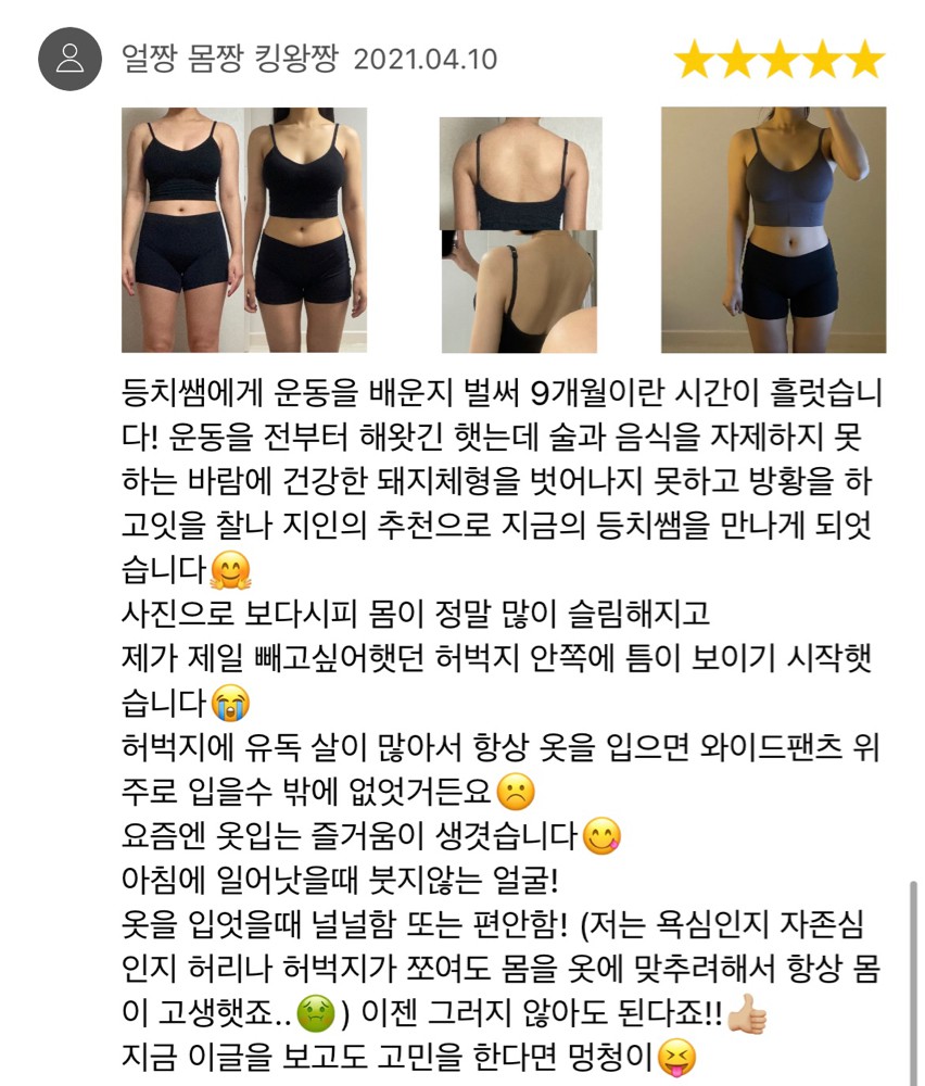 운동지식이며 자세를 케어해 주시는 것이 다른 곳에서 운동했을 때보다 확실히 다르다고 느꼈습니다👍👍이전에는 다이어트한다면 무조건 운동 후 굶었는데 쌤은 절대 못 굶게 하셔서 ㅎㅎ 식습관부터 고치는게 중요하다 하셔서 절대 굶지않으려고 노력했습니다.