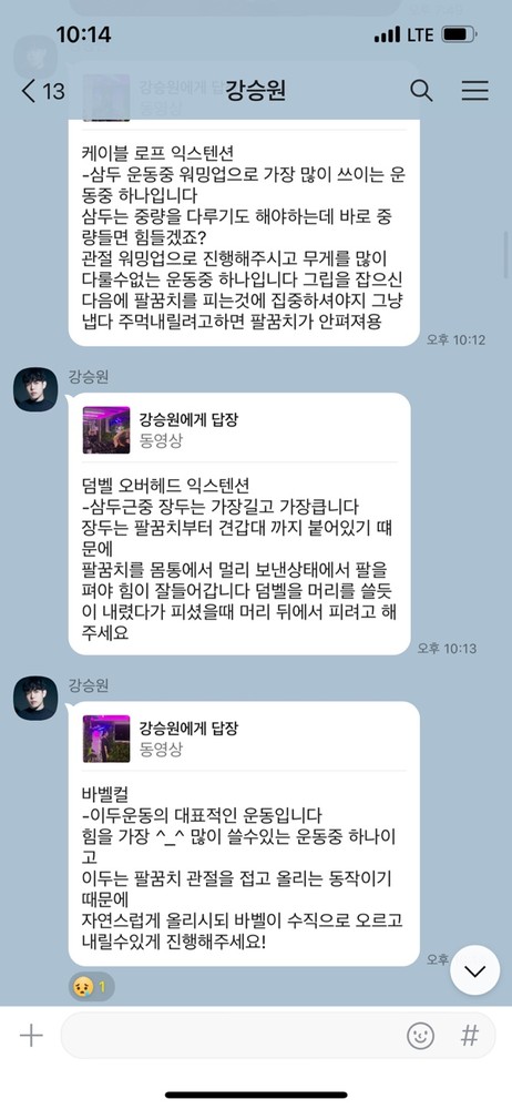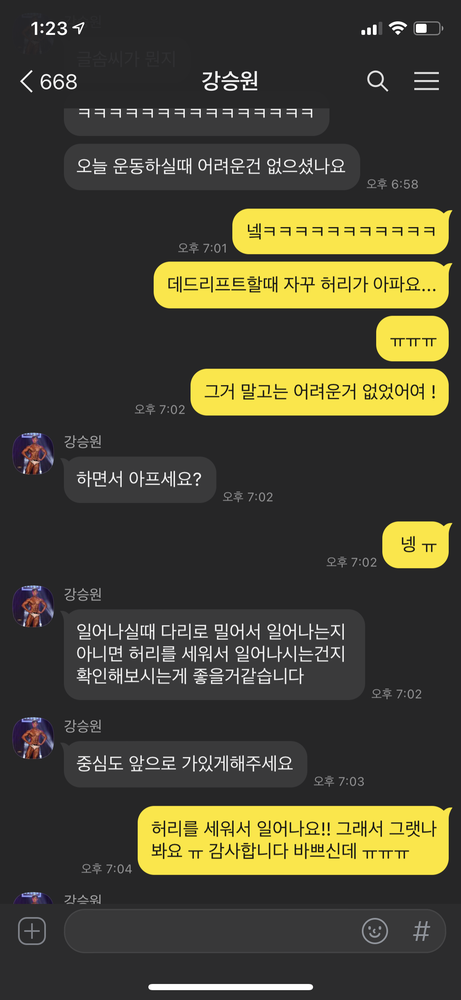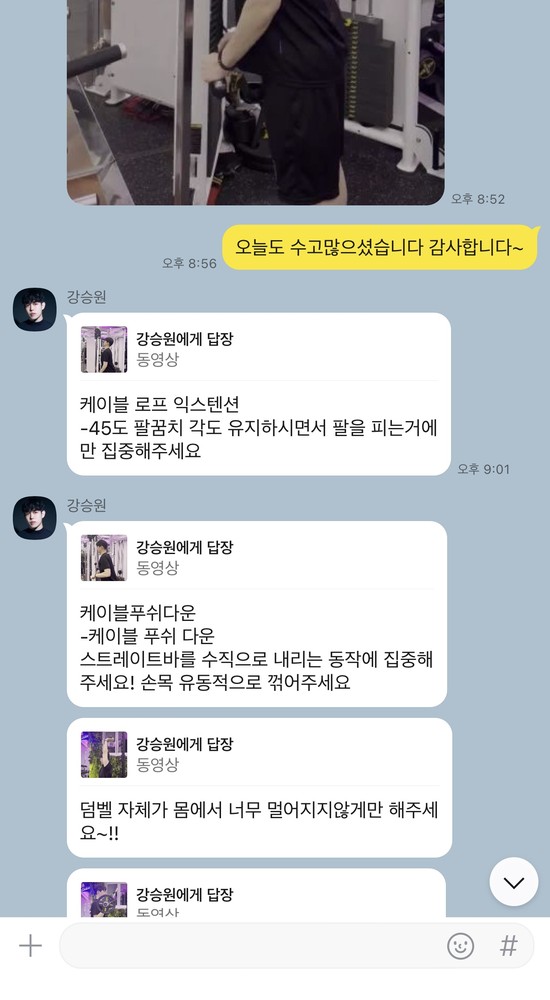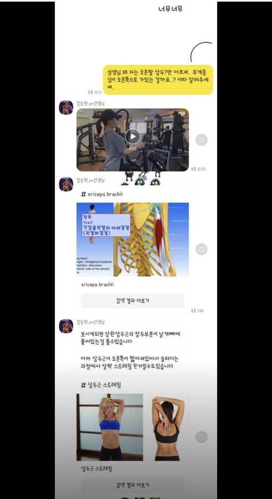 제가 운동하면서 특히 아팠던 부분들이 있었는데 그때마다 항상 스트레칭 해주시고 그 부분이 그렇게 아플 수 있는 원인을 설명해주시면서 다음 수업때 특히 신경써주셔서 너무 감사했습니다ㅎㅎ 다른쌤도 아닌 승원쌤을 만나서 너무 다행인거같아요!