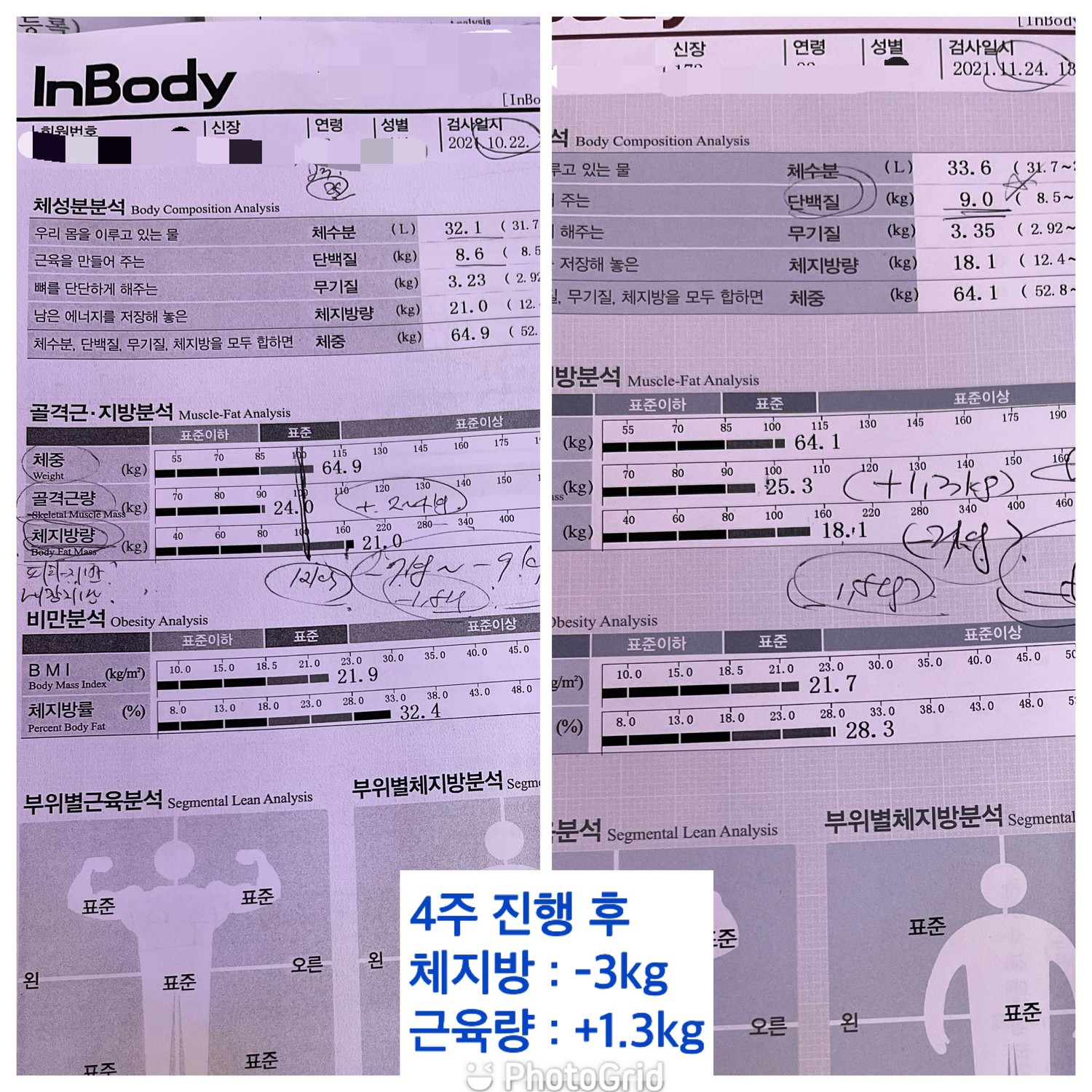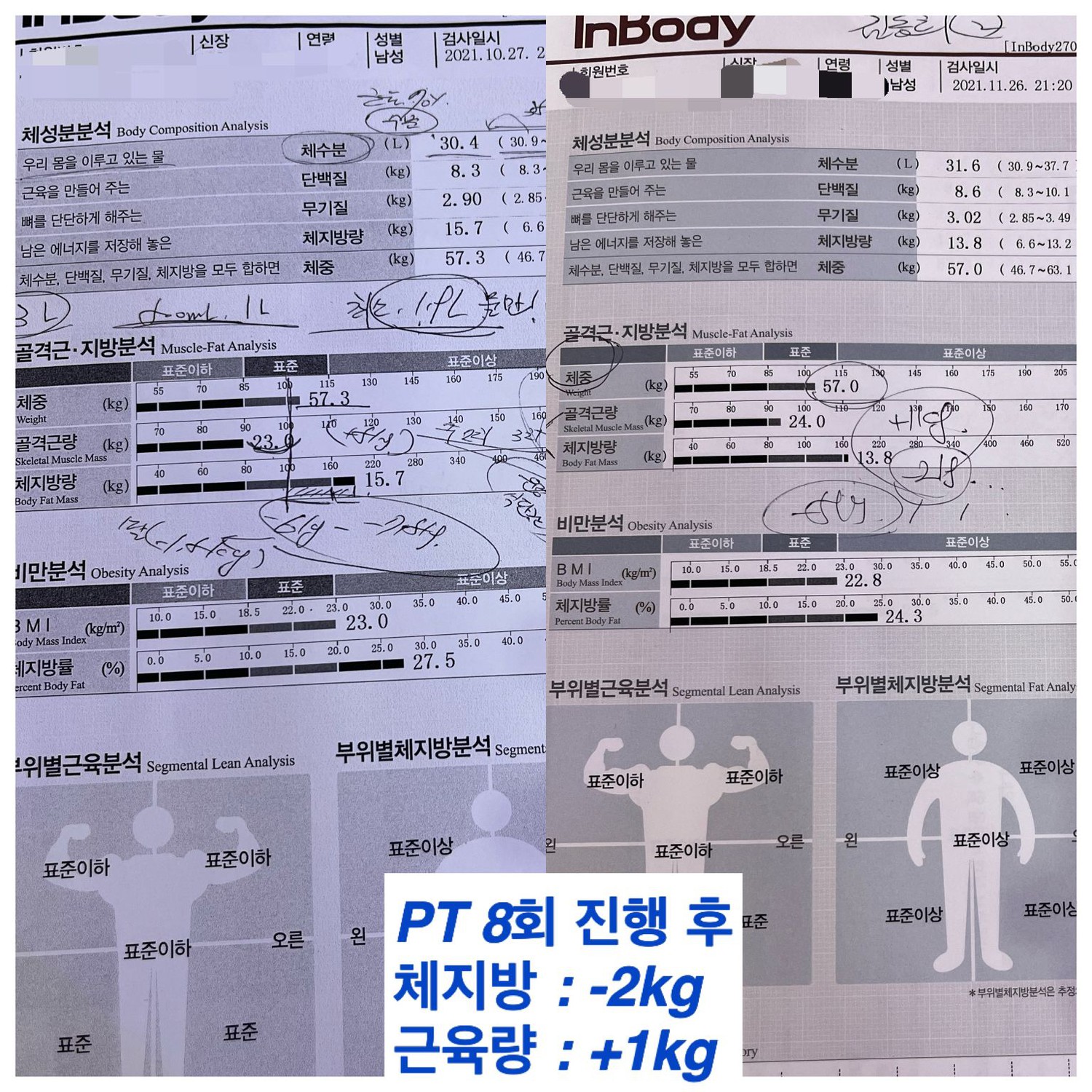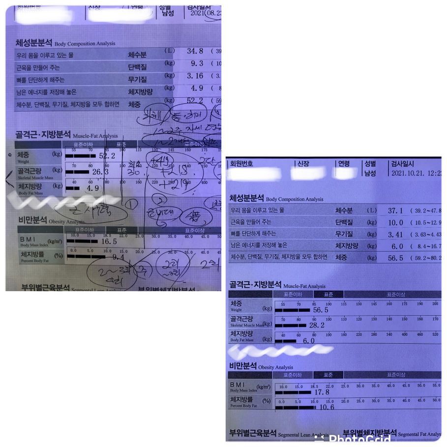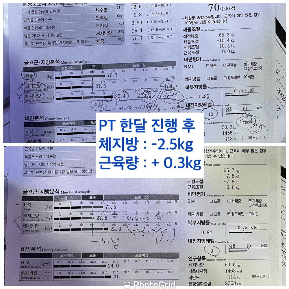 코로나 이후로 운동을 안해서 몸이 많이 망가지고 살도 많이 빠진 상태에서 피티를 시작하게 되었습니다. 매일 식단 관리 해주시고 모르는 부분 질문하면 친절하게 잘 대답해주십니다. 그 날 정해진 부위에 확실히 자극점을 느끼게 운동을 알려주시고 또 그렇게 시키십니다. 운동동작을 배울때 자세와 더불어 어떤 부위가 어떻게 움직이는지 원리를 설명해주시는 점이 좋았습니다. 매번 운동이 끝나면 그날의 운동영상과 주의할점들을 보내주셔서 혼자 운동할 때도 많이 도움이 됩니다. 2주 조금 넘는 기간동안 수치적으로는 근육량 1키로 넘게 늘고 체중도 2키로 정도 증가하는 긍정적인 변화가 있었고 눈바디도 늘어서 만족합니다.